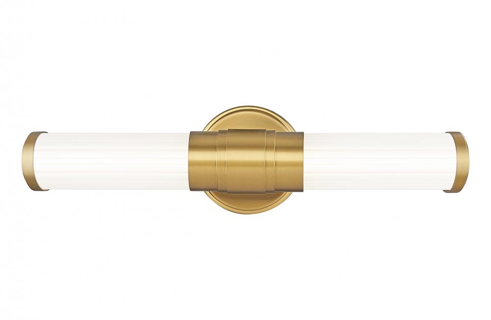 Modern gold finishing creates sophisticated warmth for the clean lines of this modern LED vanity bath light. The integrated LED is dimmable and energy efficient, offering five color selections to ensure the perfect ambiance for your space. The fixture features delicately ribbed cylinders of opal glass, ensuring inviting illumination.