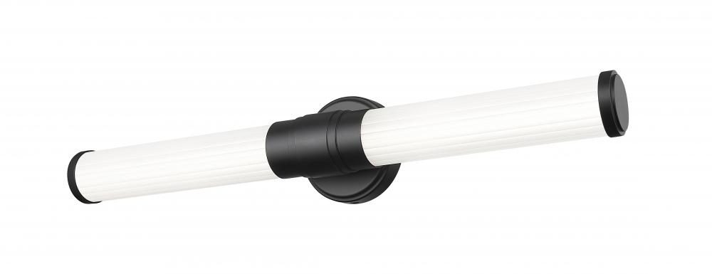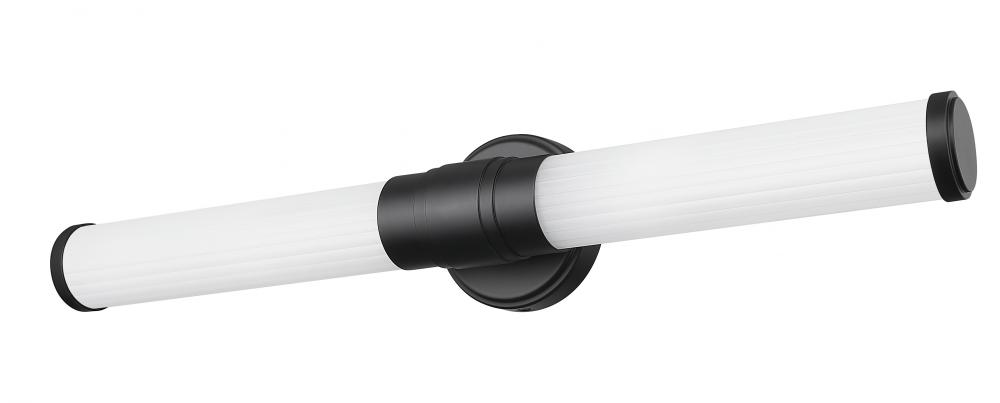 Delivering contrast and sophistication, this modern LED vanity bath light features a matte black finish over its steel frame. The round wall plate and stepped collar are understated details, complementing a pair of cylindrical opal glass shades with delicate ribbing that create just the right dose of texture and depth. The integrated LED is both dimmable and energy efficient for your contemporary home.