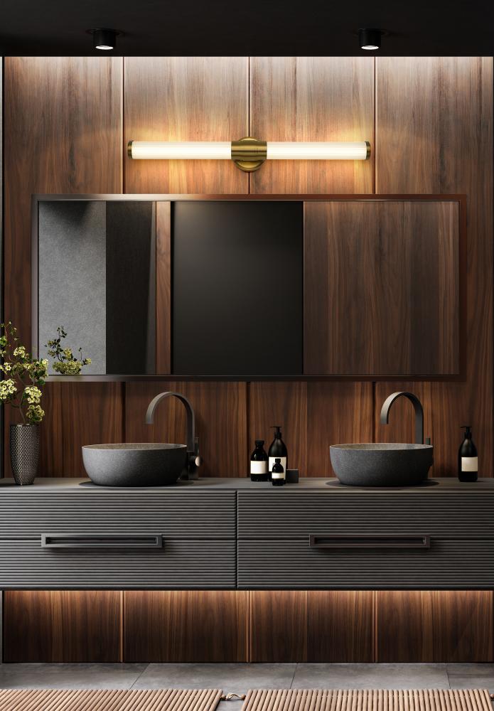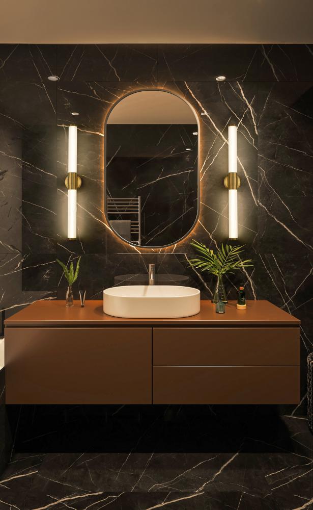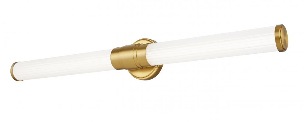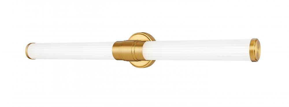 The chic warmth of a modern gold finish is the highlight of this contemporary LED vanity bath light. Two cylinder shades are made from ribbed opal glass, casting soft, diffused illumination from the integrated LED tucked under its stepped collar.