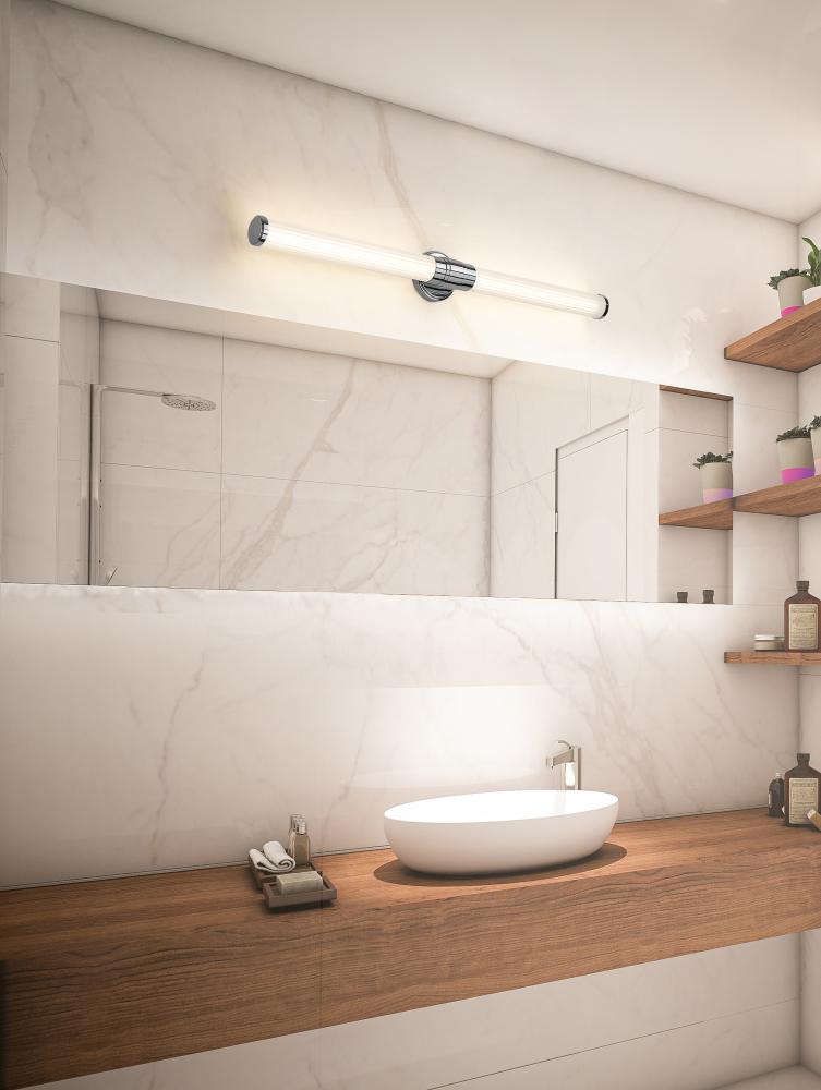 Set the tone with a sophisticated silhouette and gleaming chrome finish in this modern LED vanity bath light. A stepped collar, round wall plate, and decorative end caps create contrast as they highlight the delicacy of ribbed opal glass shades that cast inviting illumination. The dimmable LED is integrated and offers five color selections for easy versatility.