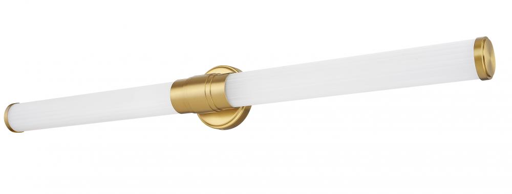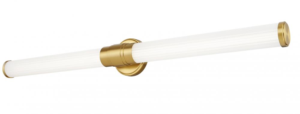 Encourage sophistication and richness with the inviting modern gold finish featured on this contemporary LED vanity bath light. Its linear silhouette features a center stepped collar and a pair of delicately ribbed opal glass shades, casting soft, diffused illumination across your space. The integrated LED is dimmable and offers color selectability, the perfect addition to an energy efficient home.