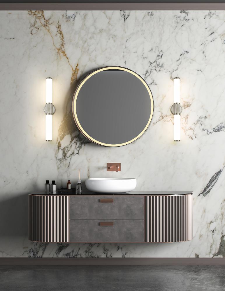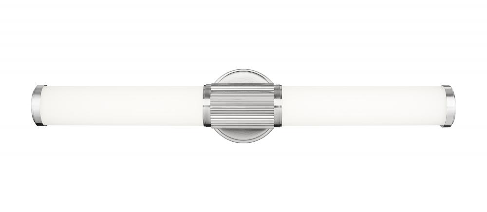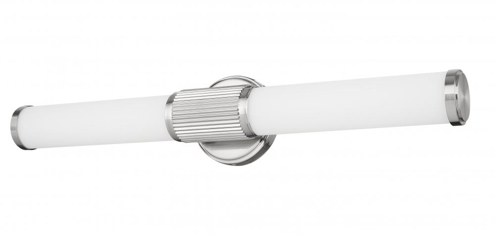 Enjoy the eye-catching fluted cuff and gleaming brushed nickel finish of this modern LED vanity bath light. It features a pair of opal glass cylinder shades, creating soft, diffused illumination thats energy efficient and inviting for tasks and ambiance.