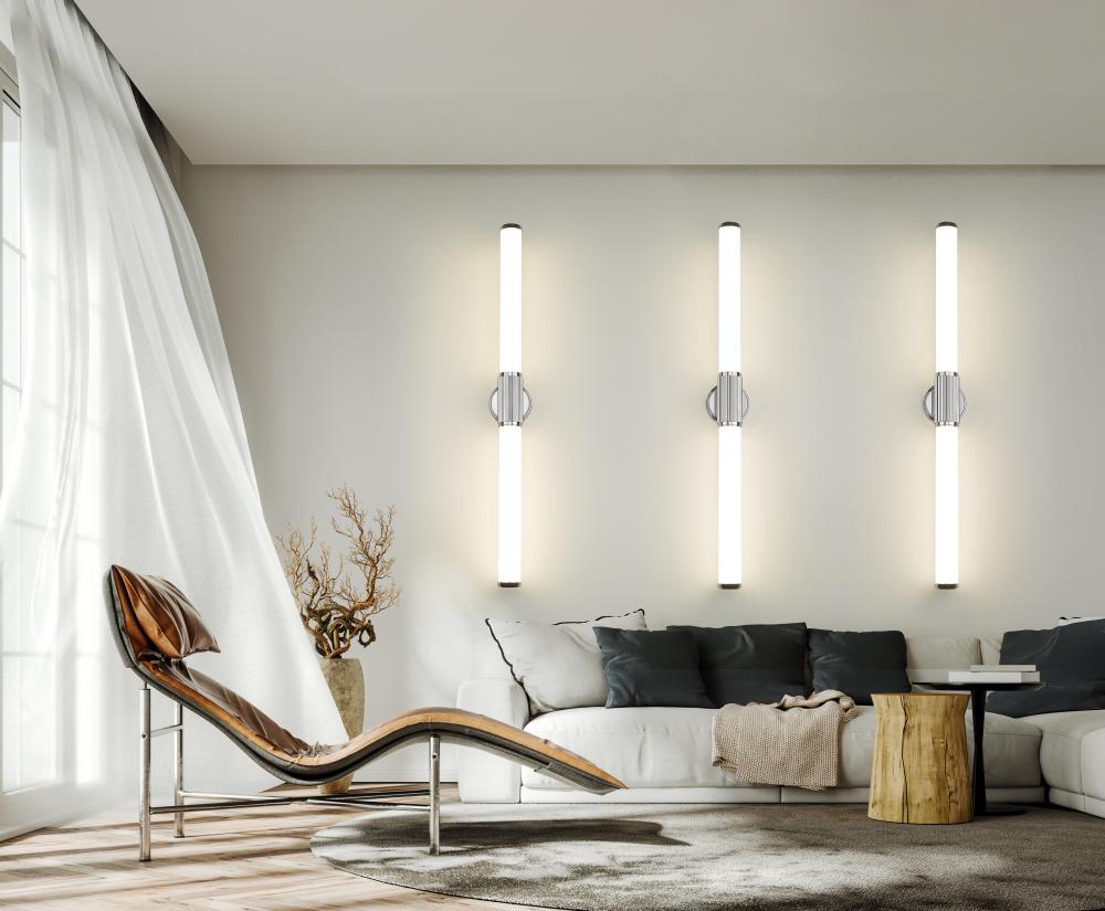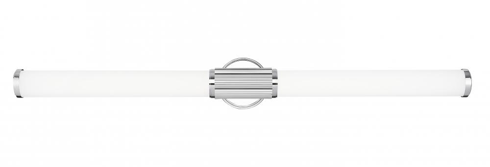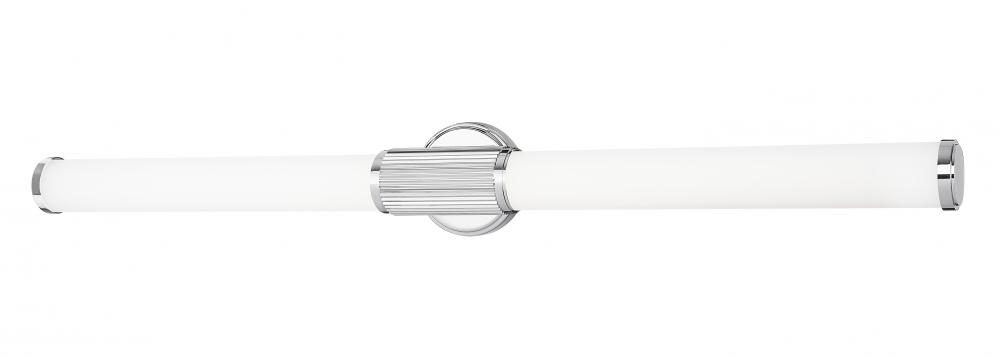 Chic chrome sets the tone for this modern LED vanity bath light. Delivering generous size and bright light, the fixture includes a pair of cylindrical opal glass shades, ensuring inviting illumination. The fixture is defined with its fluted cuff and beveled wall plate, creating a smooth, sleek appearance thats sure to elevate your en suite.