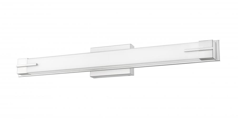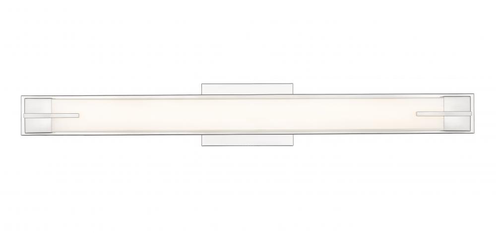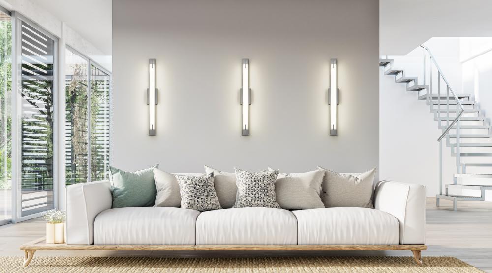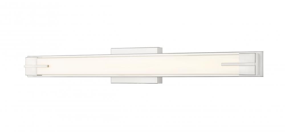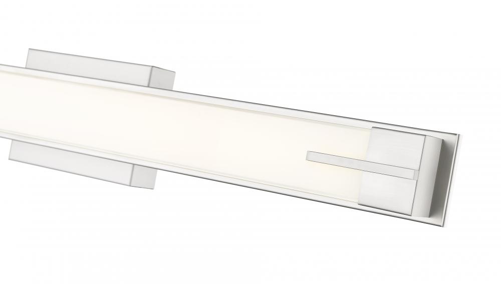 Brighten a large vanity or bath with the energy efficient integrated LED features in a modern minimalist vanity light. Its long, lean silhouette is simple and straightforward, with architectural design details and a brushed nickel finish that add a hint of character and eye-catching flair. Silk white glass diffuses illumination beautifully, creating the perfect ambiance for grooming.