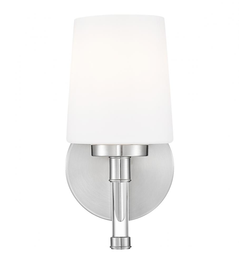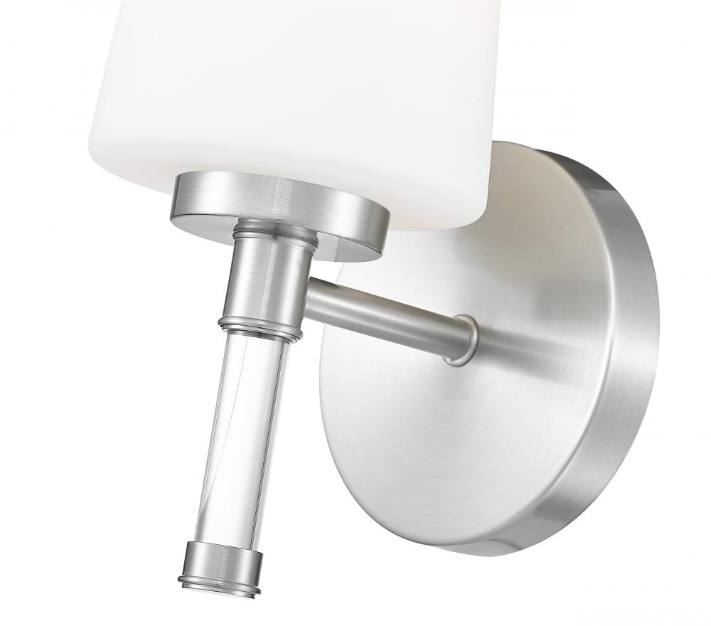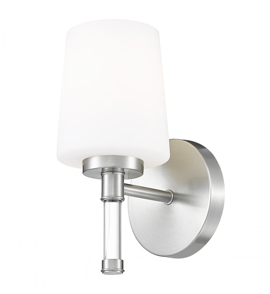 Thoughtful and compact, this brushed nickel one-light vanity light sits close to the wall, slipping easily above a slim mirror or between medicine cabinets where space is precious. Its opal glass shade gentles the bulb into an even, flattering glow so morning routines feel calm and evening skincare feels indulgent.