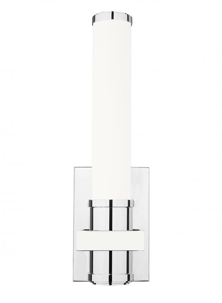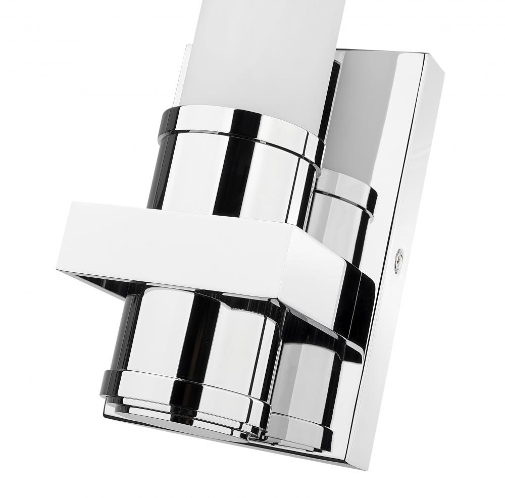 Easily adapting to any setting, this modern LED wall sconce pairs subtle decorative details with a gleaming chrome finish. Its torch-inspired silhouette is complete with a cylindrical opal glass diffuser, casting soft, glare-free illumination thats perfect for halls, living areas, baths, and bedrooms within your home. The integrated LED is an energy efficient choice that adds dimmability and color selectability to this charming design.