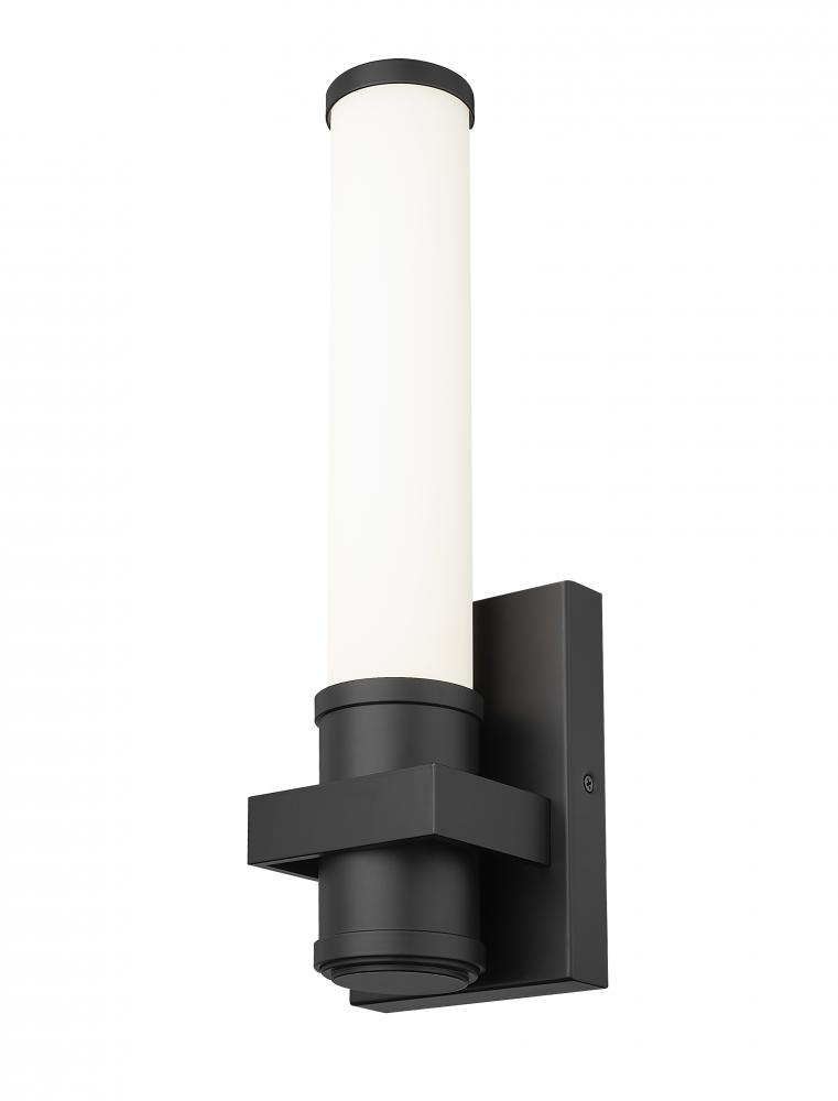 Cool and crisp in matte black, this modern LED wall sconce sets a refined tone with its geometric details, which include a square cuff and cylindrical opal glass shade. The fresh, refined look fits virtually anywhere in your home, casting soft, glare-free illumination. The dimmable LED is energy efficient and includes color selectability with five options to create the perfect ambiance for every occasion.
