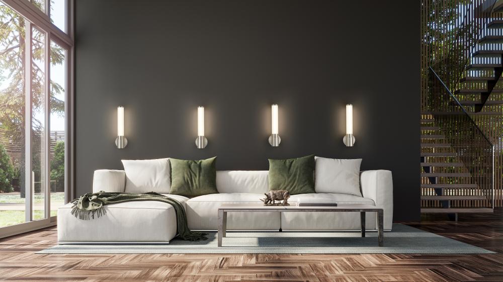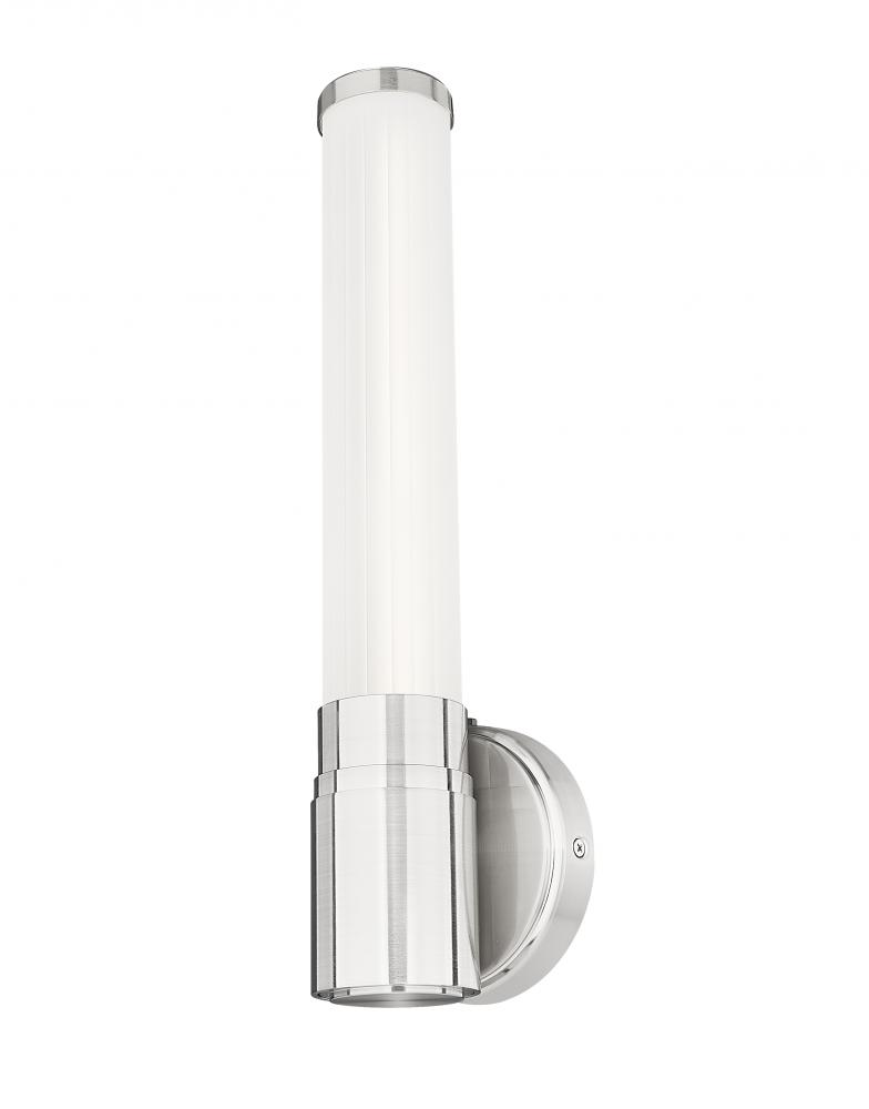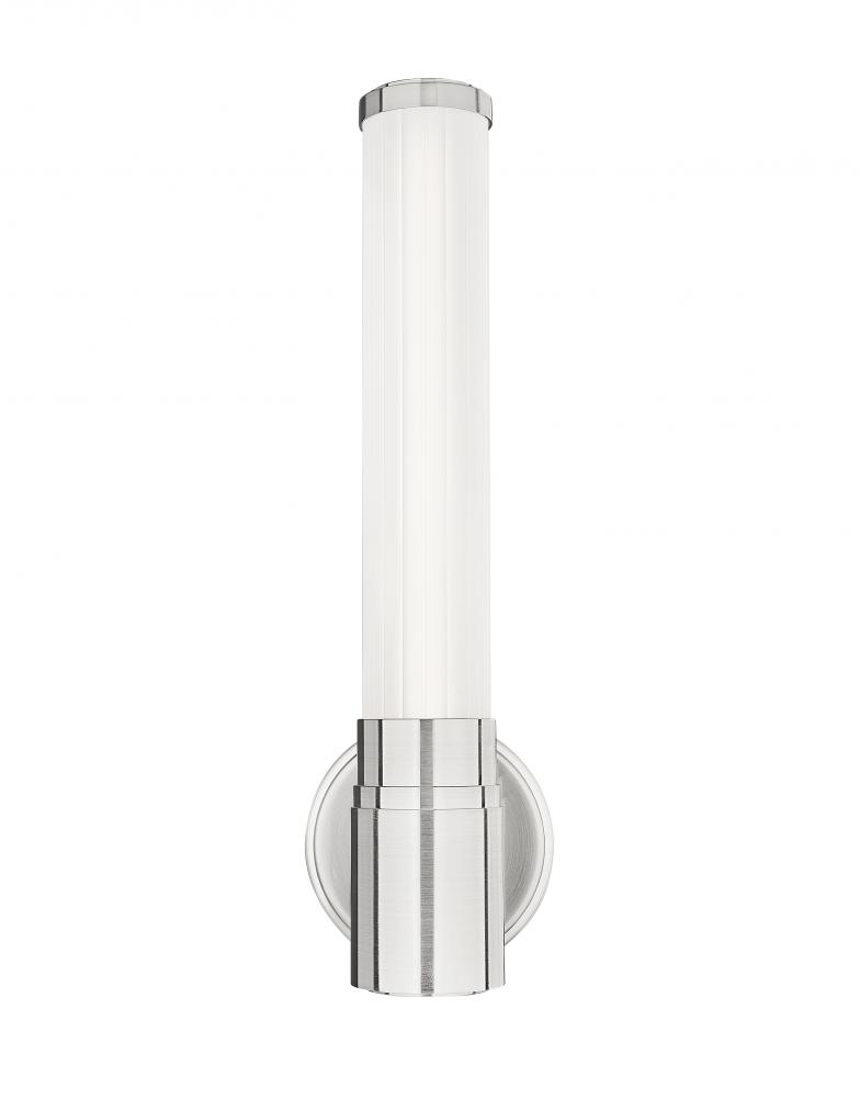 A torch-inspired silhouette pairs with delicately ribbed glass in this modern LED wall sconce. A chic choice for an entry, living area or bath, it boasts an integrated LED thats dimmable and energy efficient, while showcasing a cool brushed nickel finish that complements in any setting.