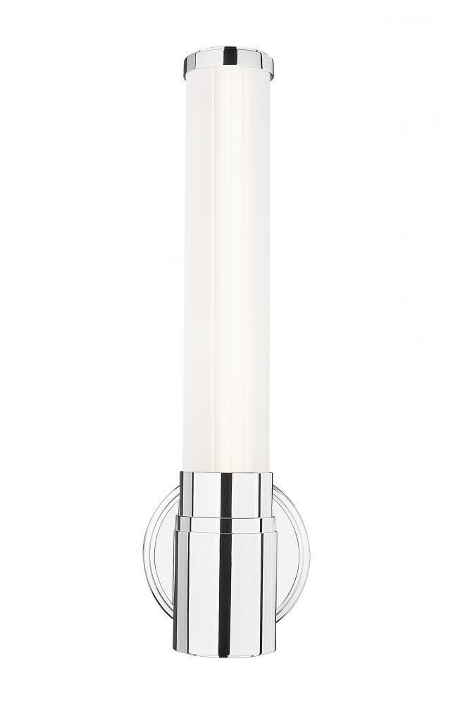 Add gleaming elegance with the clean lines and delicate ribbed opal glass featured on this modern LED wall sconce. In any room, it offers bright illumination, free from glare and both dimmable and energy efficient. The fixture features a chrome finish round wall plate and stepped collar, adding a touch of texture to a minimalist steel frame.