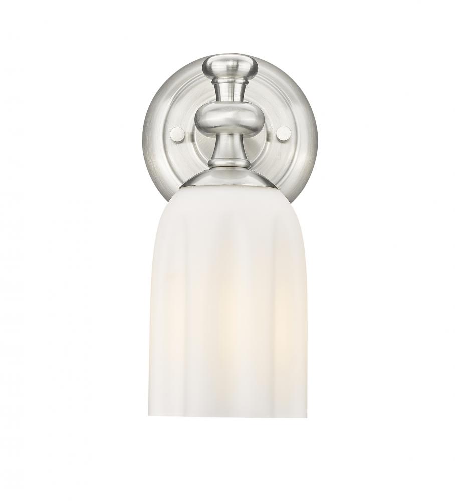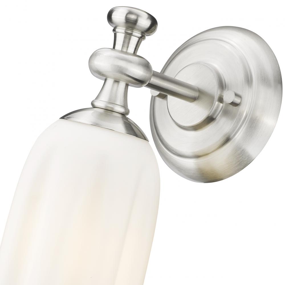 Scalloped silhouetting creates a rich, refined look for the opal glass shade featured on this modern one-light wall sconce. Lovely brushed nickel finishing decorates its metal frame, stepped wall plate, and finial, creating a refined look to complement foyers, living rooms, halls, and bedrooms with soft, ambient illumination.