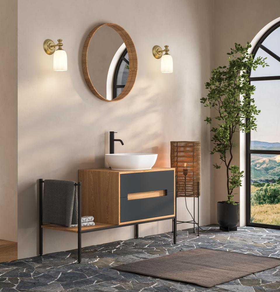 Step up the stylish presentation of your lighting with a modern one-light wall sconce. Pairing a modern gold finish and decorative flourishes, its the perfect choice for a refined living space, bedroom, or bath, creating a hint of vintage romance and charm with scalloped glass and its eye-catching arm and wall plate. Opal etched glass shades the light and ensures a soft, inviting look and feel.