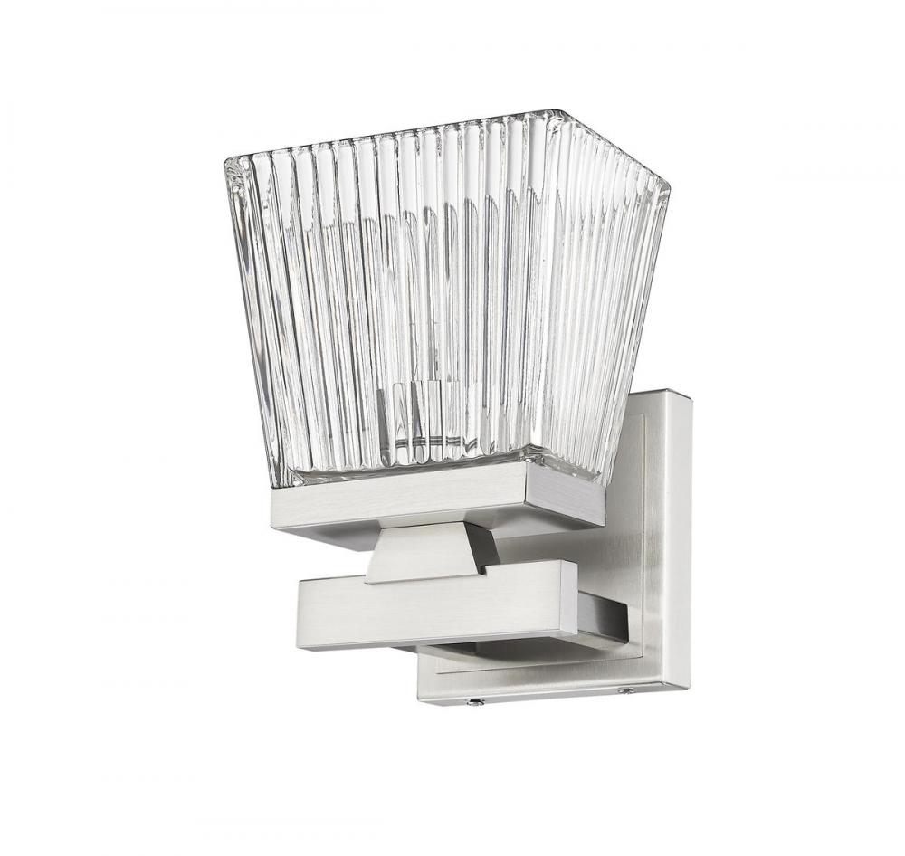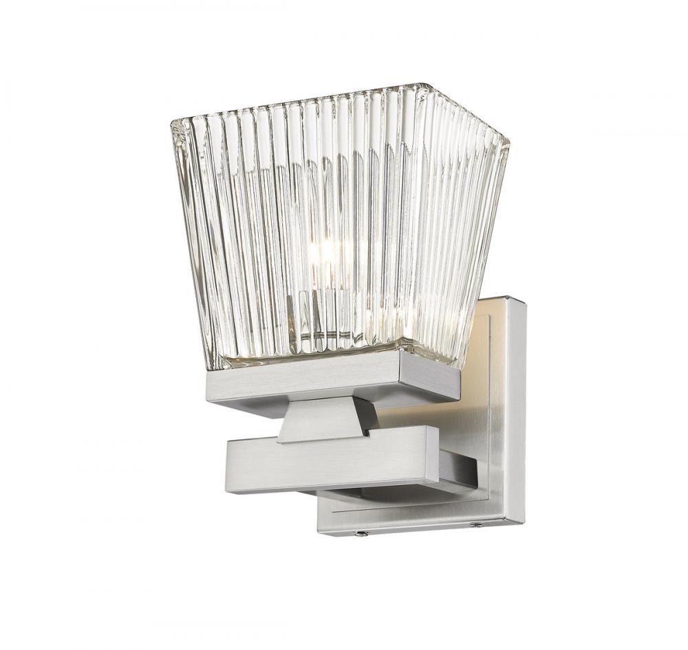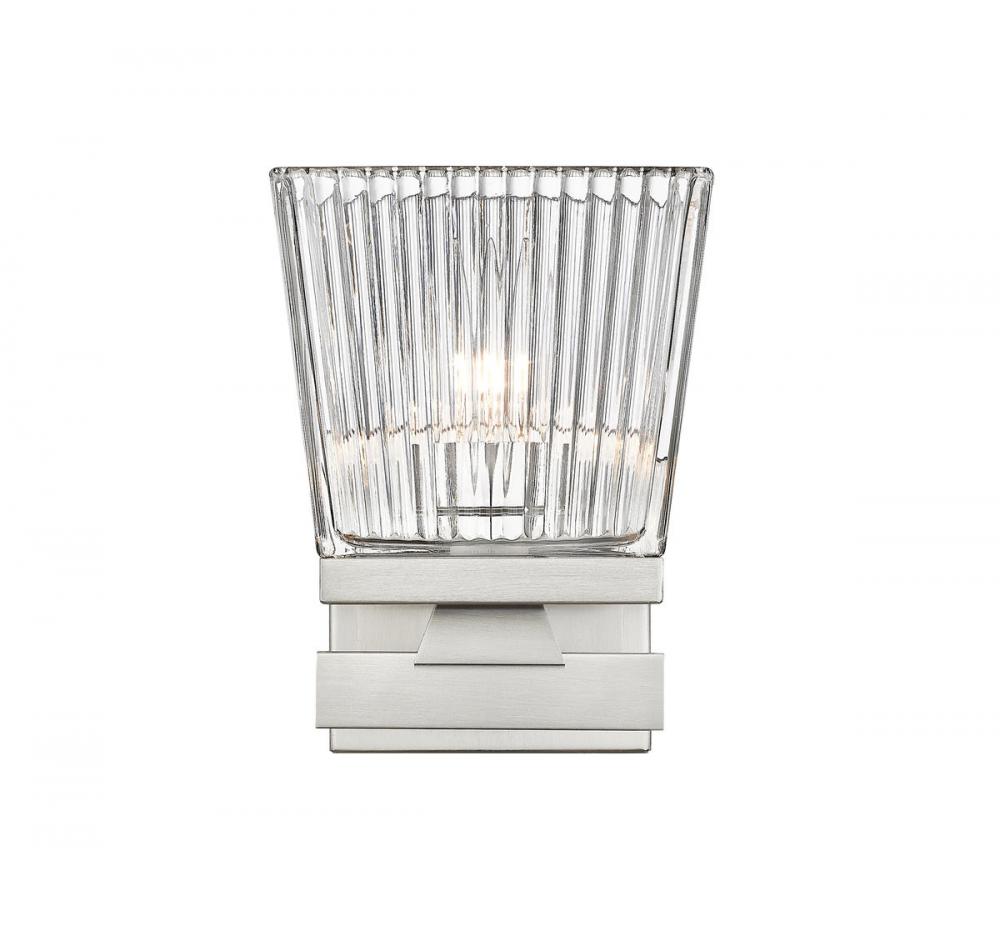 This modern brushed nickel wall sconce is the perfect update to bathrooms and hallways. Featuring a steel construction with clear glass shades with a ribbed texture, its a stunning sconce with farmhouse flair.