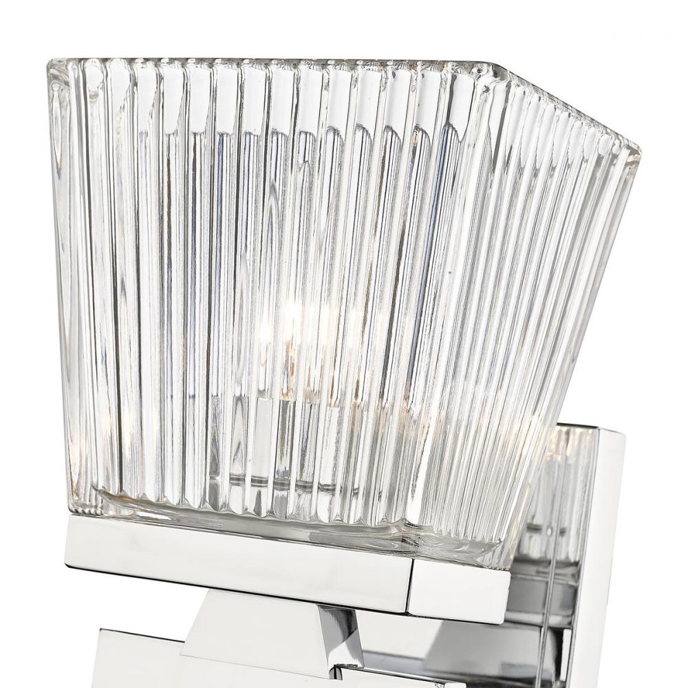 This modern chrome wall sconce is the perfect update to bathrooms and hallways. Featuring a steel construction with clear glass shades with a ribbed texture, its a stunning sconce with farmhouse flair.