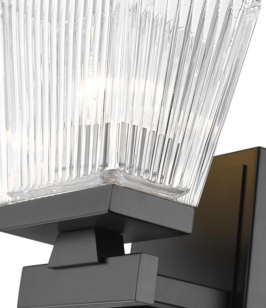 This modern matte black wall sconce is the perfect update to bathrooms and hallways. Featuring a steel construction with clear glass shades with a ribbed texture, its a stunning sconce with farmhouse flair.