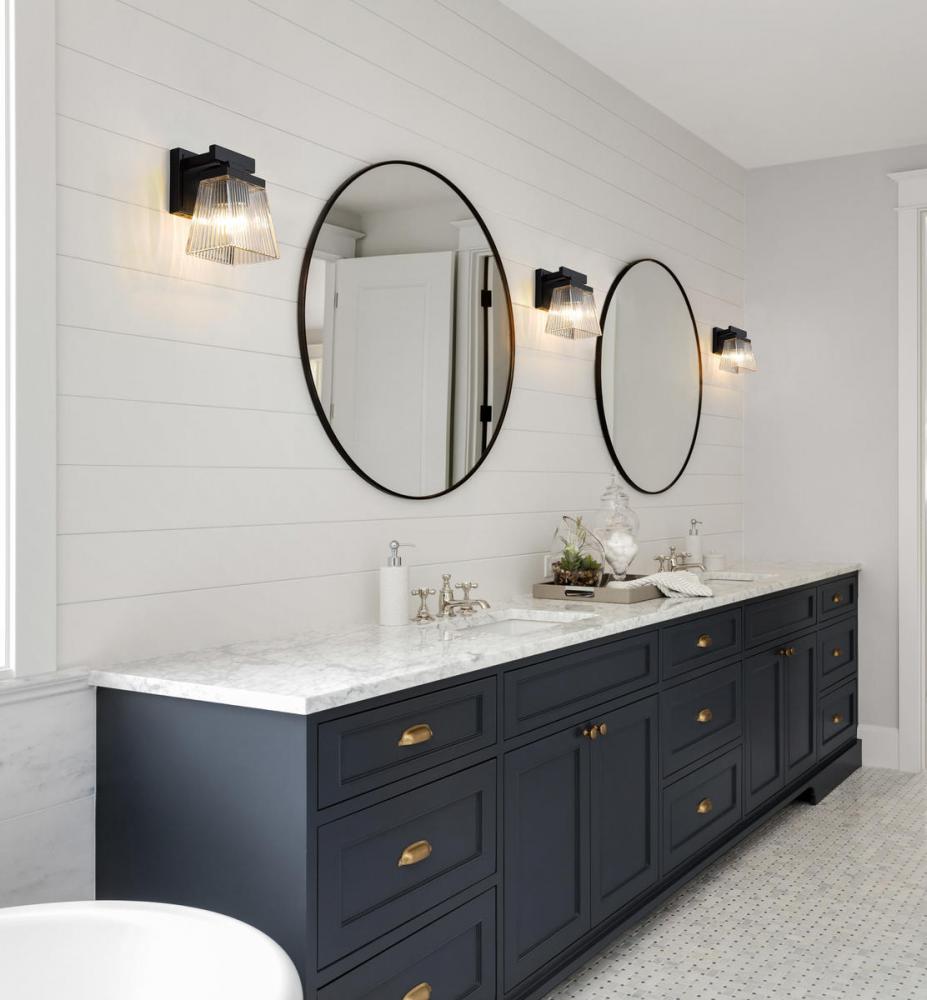 Modern and sleek, the Astor Collection of vanity fixtures can enhance a myriad of designs from industrial to Modern Farmhouse, depending on the glass style (smooth opal or ribbed crystal) and finish (Matte Black, Chrome, or Brushed Nickel) selected.