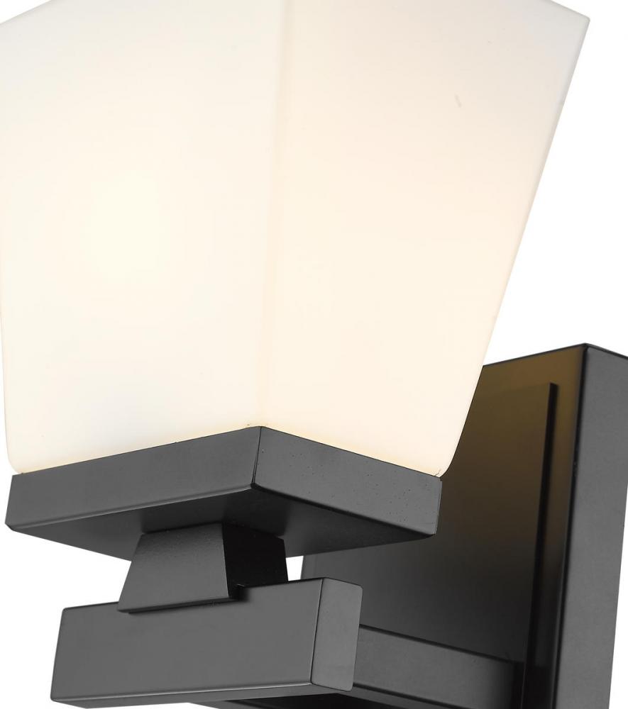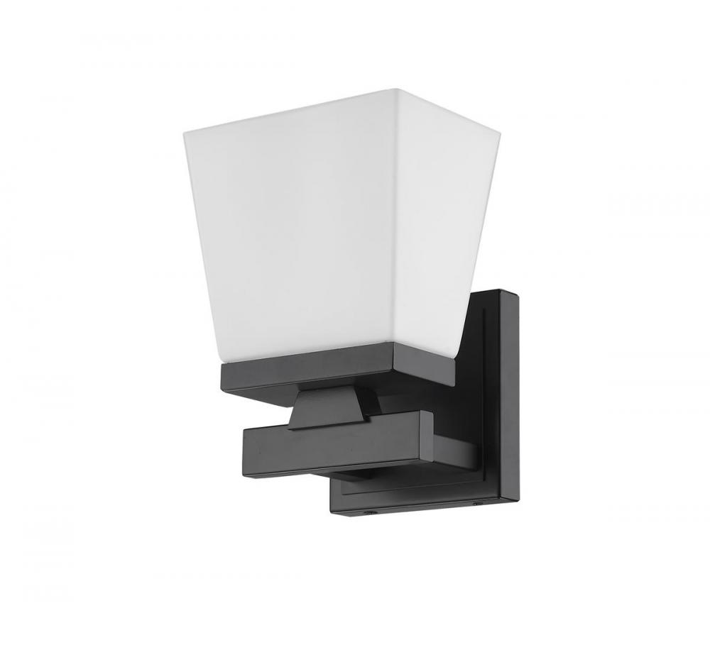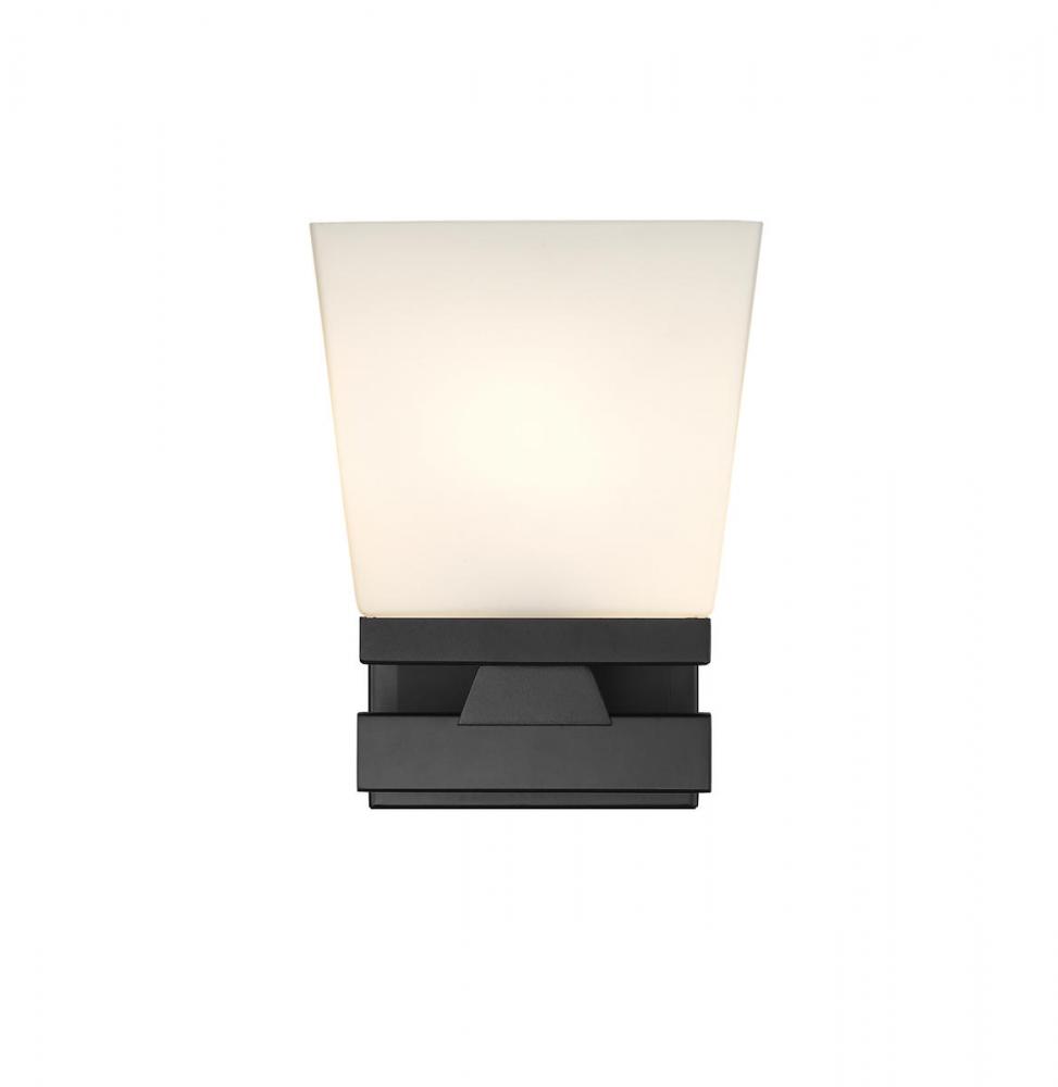 Invite modern farmhouse flair vibes into your home with a matte black wall sconce. This wall sconce showcases a glass shade in etched opal. The matte black finish contributes to the timeless appearance, while steel construction offers both style and aesthetic allure.