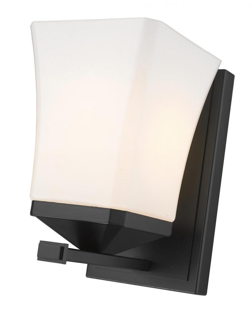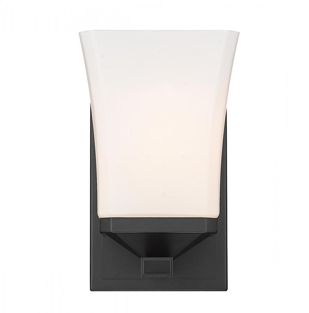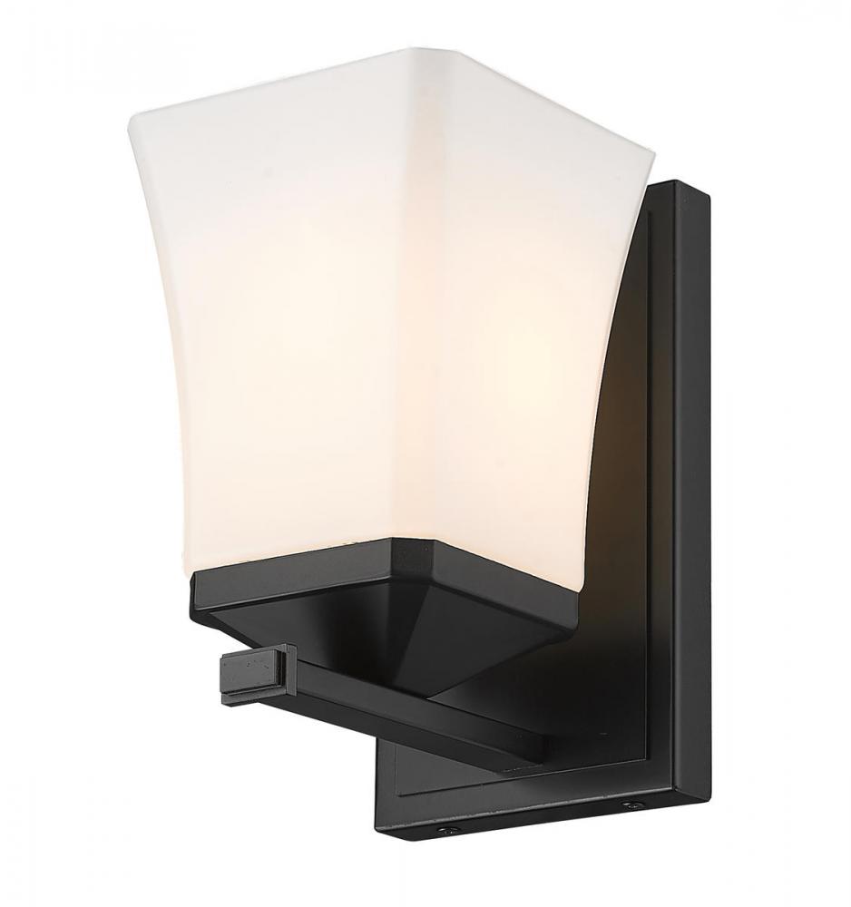 Provide a warm and inviting ambiance to your bathroom with a transitional style wall sconce. The sleek opal etched glass shade makes for ambient lighting. This sconce is constructed from steel with matte black finish and a flared silhouette.