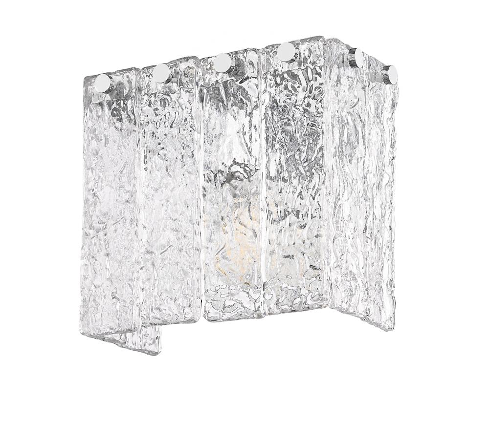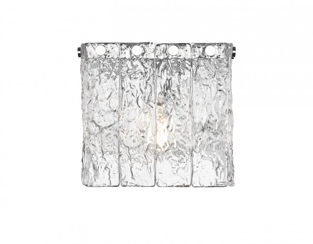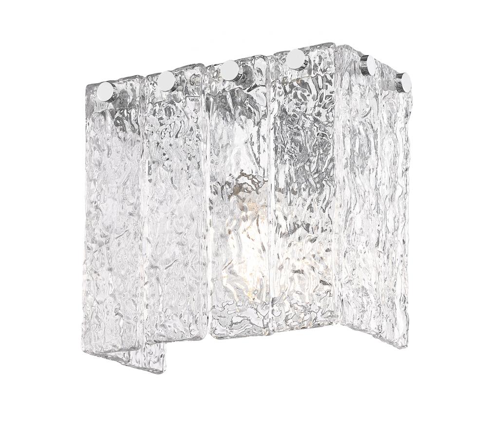 A chrome finish adds icy reflectivity and contrast to the stunning textured clear glass panels displayed on a modern one-light wall sconce. Perfect for the vanity, hall, or living room, this sconce delivers engaging character with its m?lange of texture and dimensionality. The cool look of melting ice creates a strikingly bold display in your home.