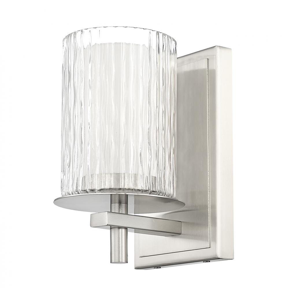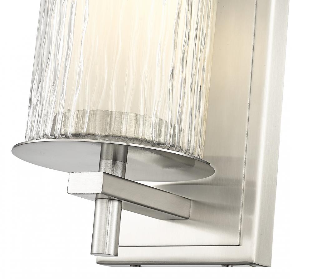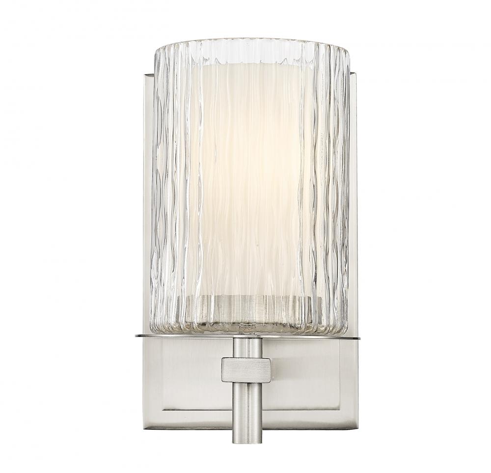 A sleek layered design blending glass and steel begins a look of elegance in this one-light wall sconce, a great option for contemporary bath spaces. Intricate detail is textural and artisan with clear glasswork in a cylinder shape, with an inner white diffuser. Etched opal and clear glass blend as they enhance chic brushed nickel finish steel framing and show off a crisp mix of circles and lines.