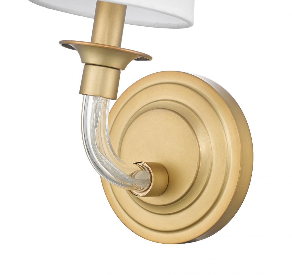 Cool glass and a rubbed brass finish create the perfect combination for this modern one-light wall sconce. Its round wall plate pairs with a slim glass arm, lending exceptional delicacy and classical ambiance. On top, a tapering shade in white fabric casts glowing, rich light, perfect for living areas and bedrooms, alike.