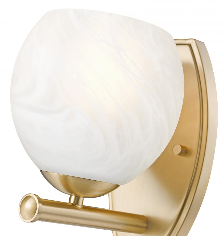 Timeless curves captivate on a transitional one-light bathroom vanity wall sconce. Its modern gold finish is rich and warm, adding a pop of personality in your bath or living space. A rounded shade in a feathered opaque white swirl pattern is a chic finishing touch.