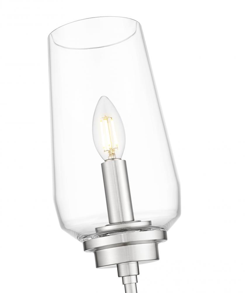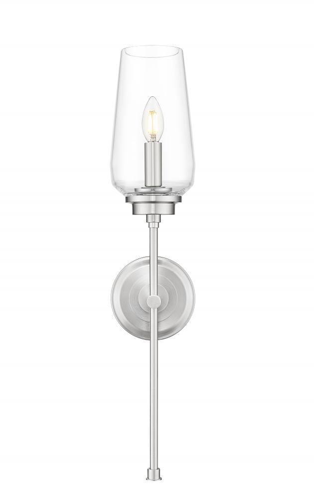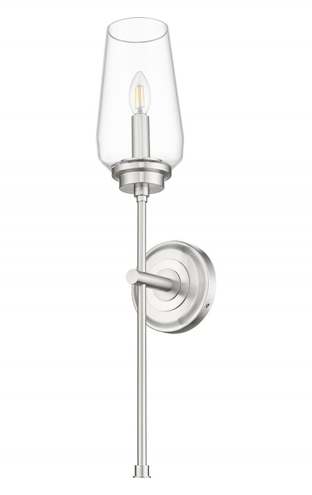 The timeless elegance of a tall, tapered glass bowl shade captures attention on this transitional one-light wall sconce. Beautiful in clean, refined decor, it features a single candelabra light and a long, slim stem that creates the illusion of a beautiful wine goblet. Its brushed nickel finish is subtle and sophisticated, perfect for living areas, bedrooms, and baths.