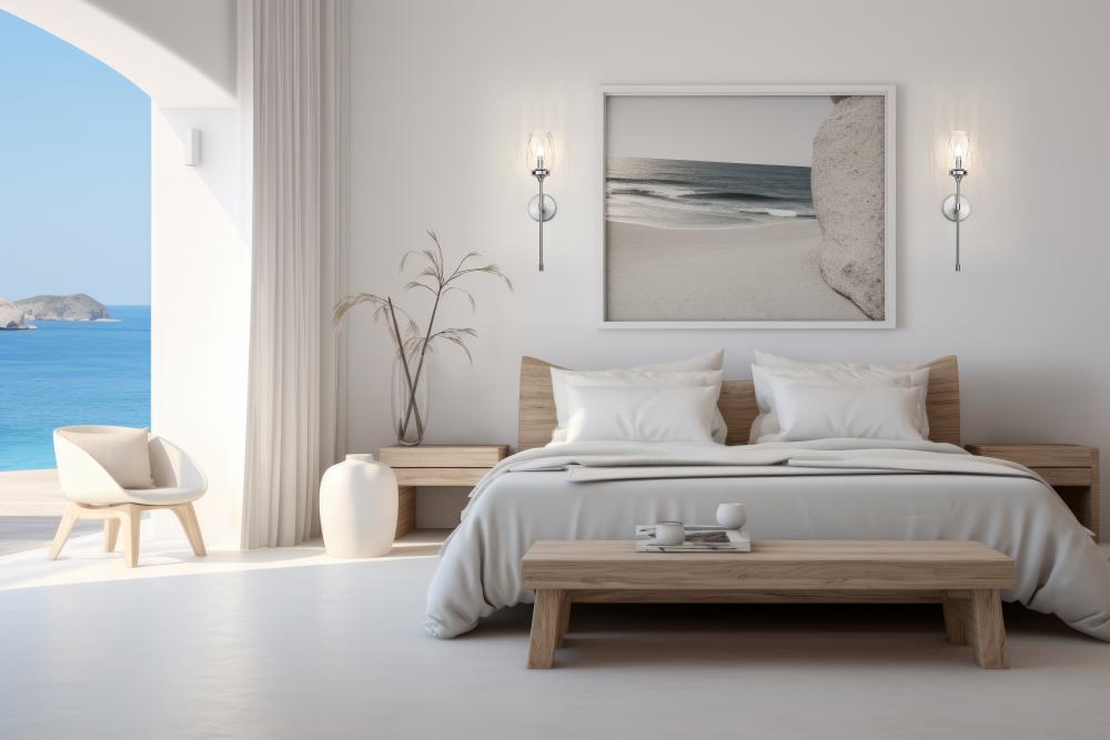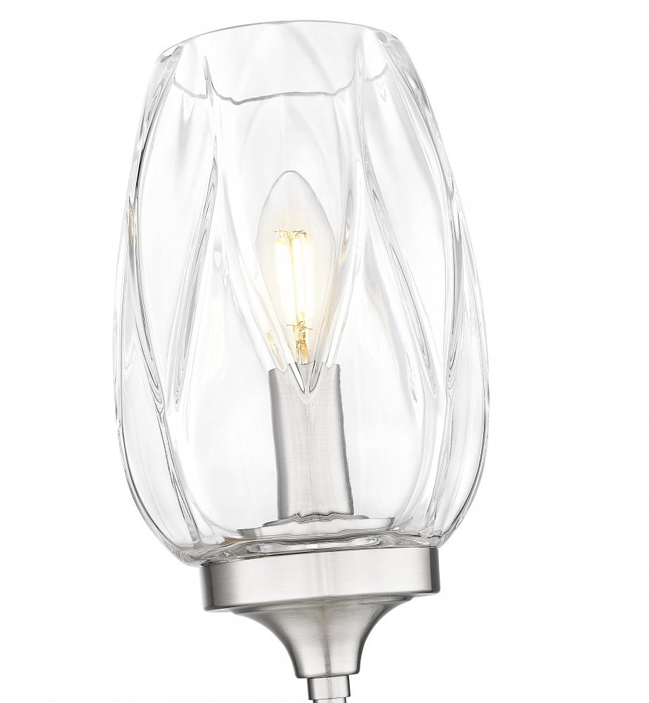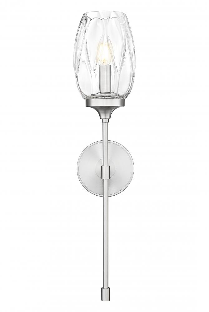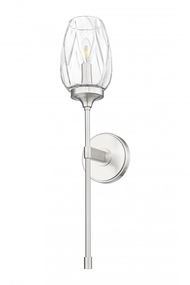 Tulip glass with a subtle textured pattern perfectly enhances the clean lines and elegant structure of this transitional one-light wall sconce. A long, slim stem evokes a flower or a wine goblet, adding the perfect dose of character in your lounge, living room, or bath. A brushed nickel finish and smooth, round wall plate complete the look.