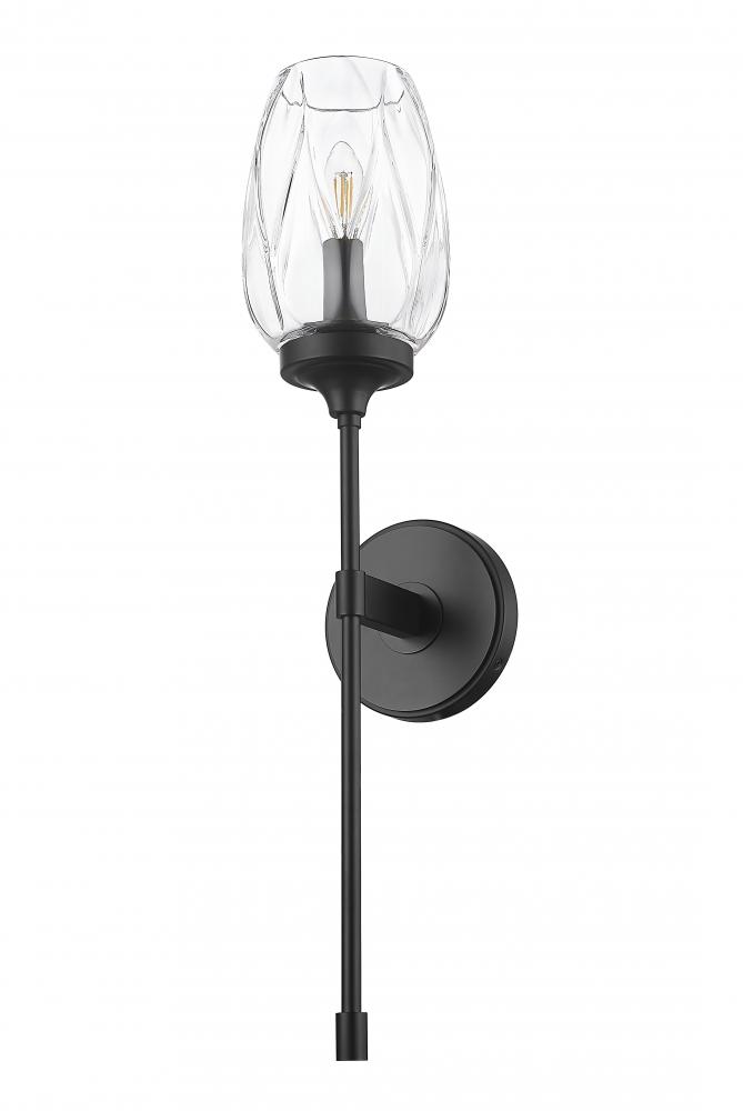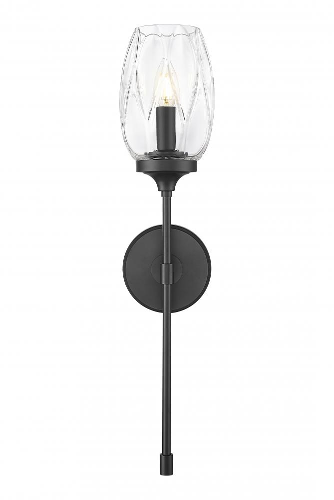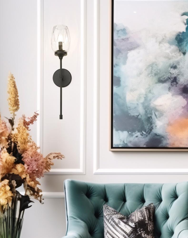 Capture refined aesthetics with the graceful tulip design of a transitional one-light wall sconce. Its clear textured glass is delicately patterned, adding a touch of flair that enhances without overwhelming. Matte black finishing adds definition and distinction to its round wall plate and long, slim stem.