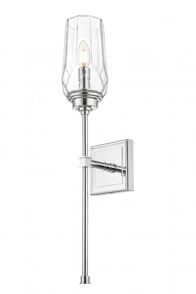 Superb design radiates from every detail in this transitional one-light wall sconce with a unique diamond patterned glass shade. Its polished nickel finish gleams in the light, adding depth and refined character. Beveling adds dimension to its wall plate, while a tall, tapering shade hosts a single candelabra light for inviting ambiance in any setting.
