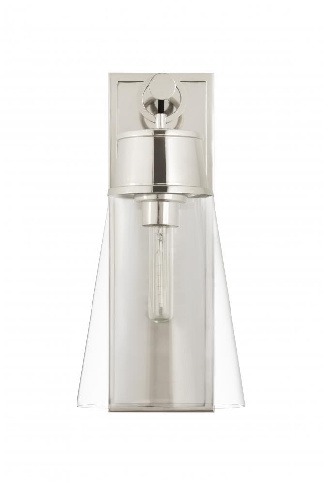 Gleaming elegance delivers a glam aesthetic in the Wentworth wall sconce, a superb choice for updating contemporary spaces with chic sparkle. Its conical shade made of clear glass suspends with a charming loop ring and mounts to a sleek, slender wall plate, all metal elements reflecting a radiant polished nickel finish. This wall light borrows a page from romantic nautical aesthetics.