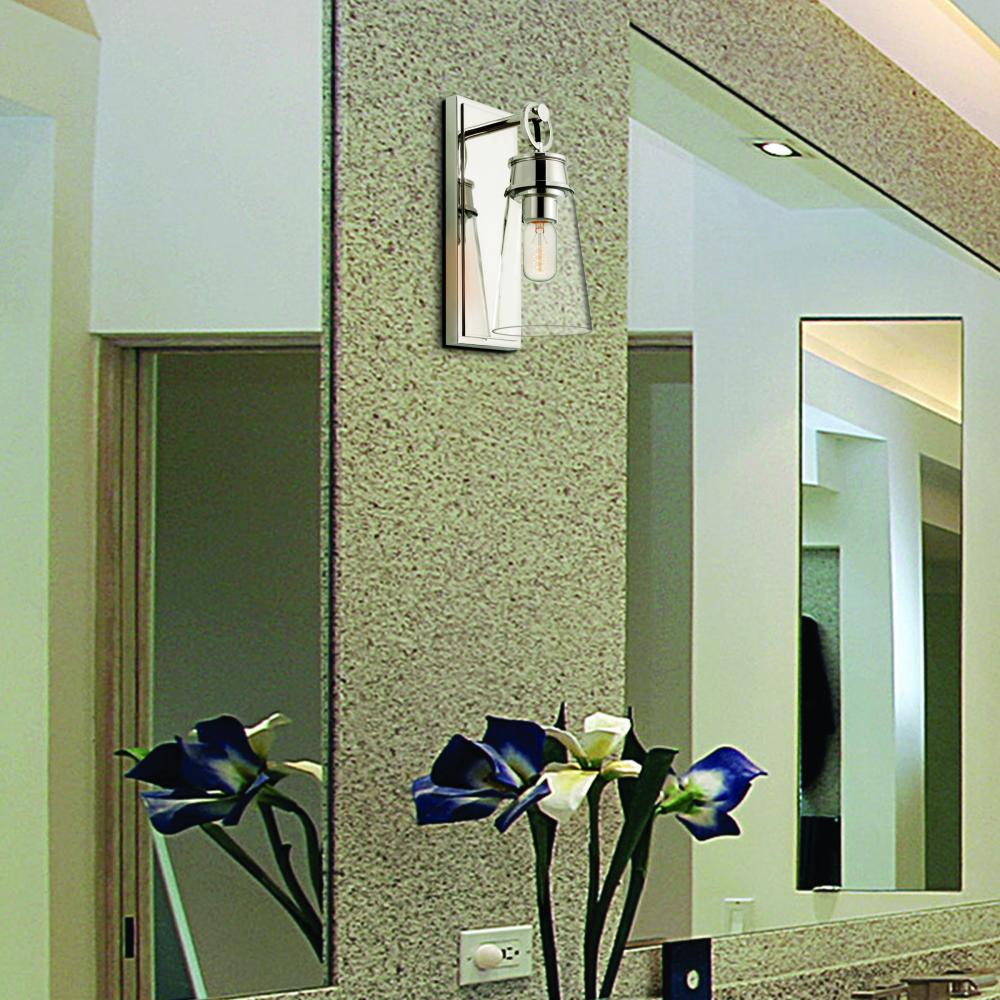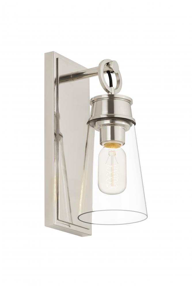 The polished nickel single-light wall sconce delivers contemporary vibes with a romantic hint of nautical fare. Dress up a classic modern hallway or wall with a carefully designed fixture featuring a sparkling clear glass conical shade and a collection of accents fashioned of polished nickel finish metal.