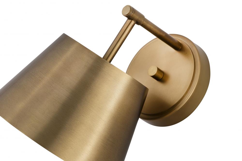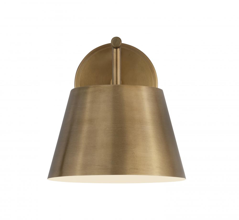 A modern empire shade is crafted in metal and showcases a white interior for bright direct illumination from this modern one-light wall sconce. The stylish look is eminently versatile, offering a refined rubbed brass finish in living rooms, halls, bedrooms and beyond.