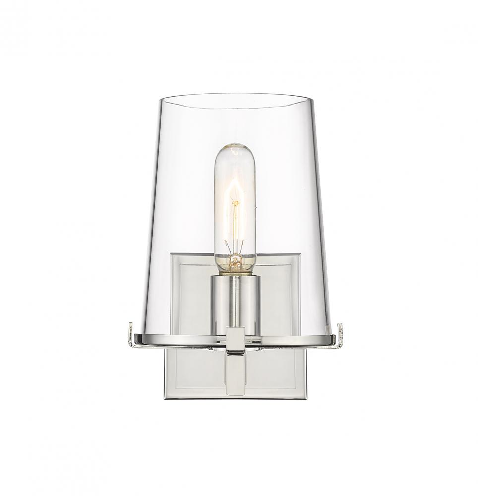 Create a chic glam look in a transitional bathroom with updated character and sophistication, adding the Callista one-light vanity light to a custom bath space. This fixture features an interesting tapered silhouette thanks to a delicate clear glass shade shielding a singular bulb mount. Hand-crafted to ensure artistry and presentation, its gleaming polished nickel finish steel frame and wall mount delivers on sparkle and adds definition suitable to impress.