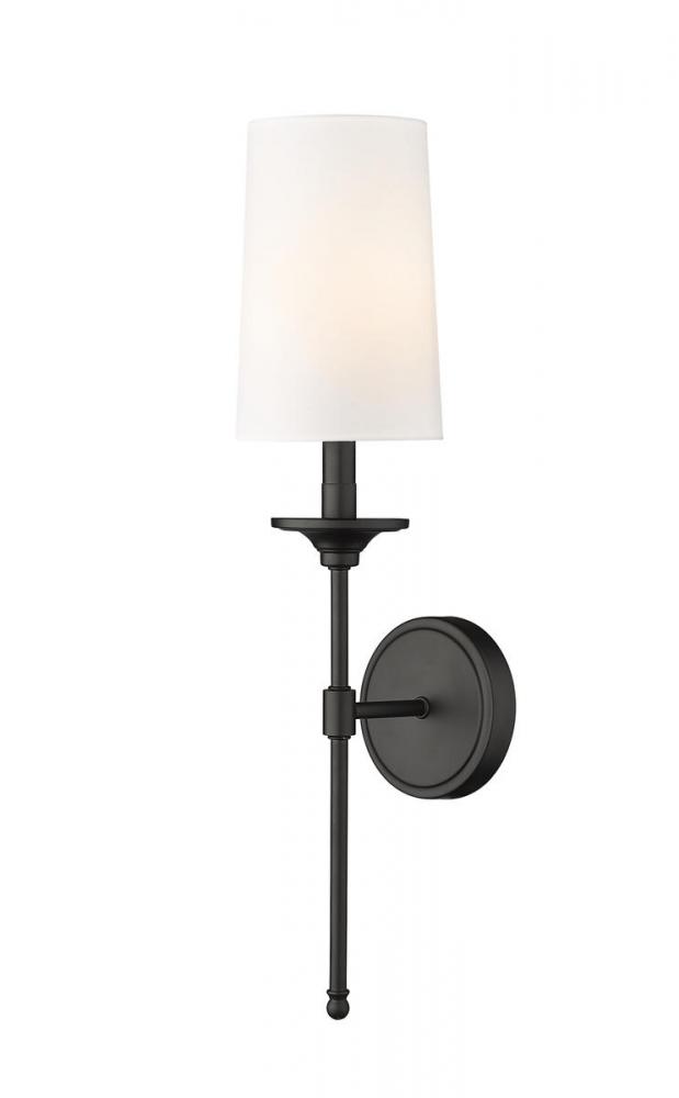 Ideal for a traditional or transitional design scheme, the sleek, elegant Emily sconce creates a warm and inviting atmosphere. This single-light wall sconce features a rich, matte black finish and a classic cloth shade for a softly diffused glow.