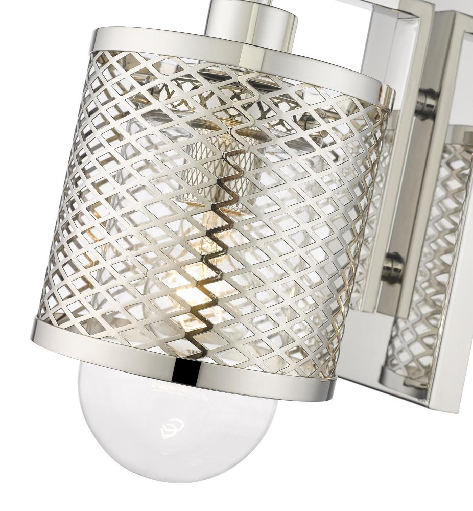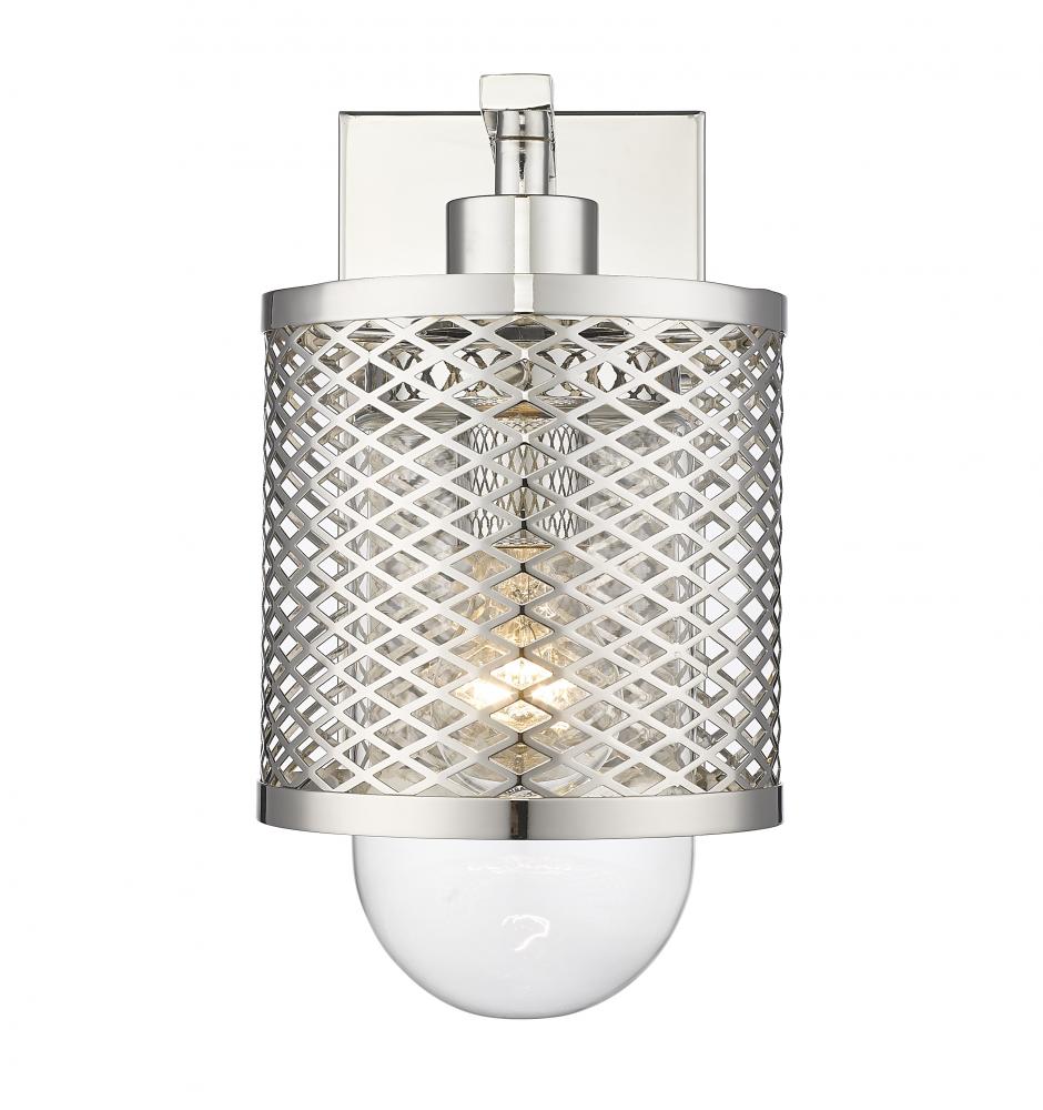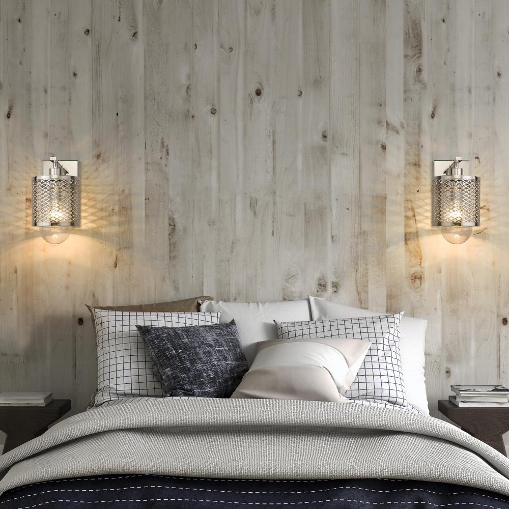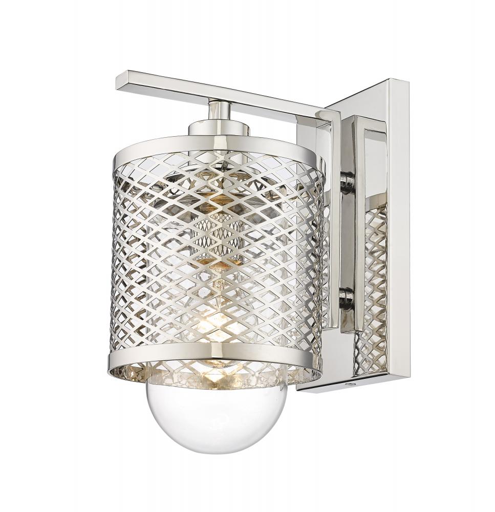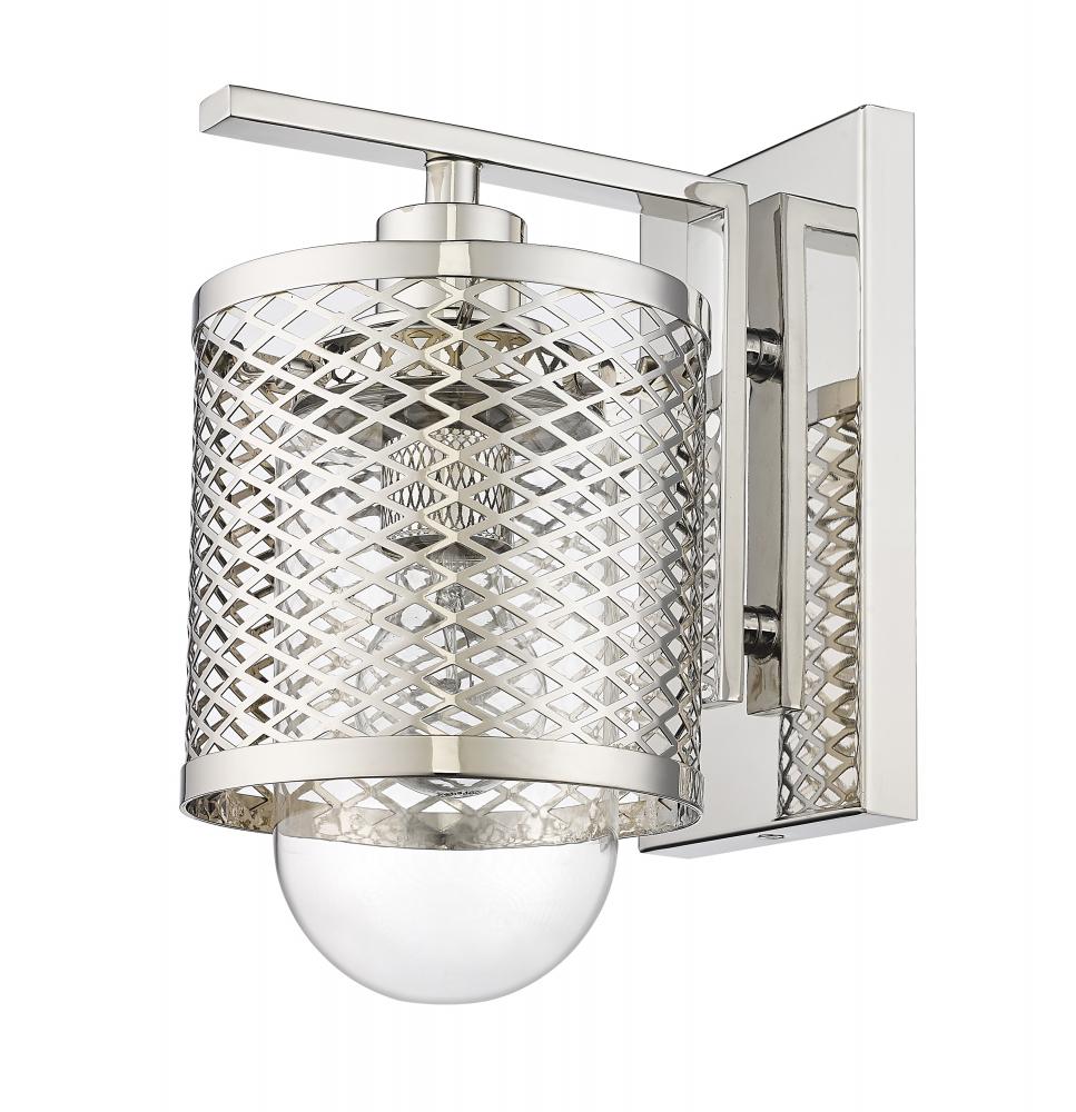 Industrial modern influences make way for this metropolitan single light sconce. A perfect addition for bathroom vanities and welcoming foyers, this transitional wall sconce features a classical mesh metal cage in a lustrous polished nickel finish for a glamorous touch. A clear glass interior shade showcases filament bulbs, lending an old-world feel and is capped with clear globe that peeks out from beneath and offers a diffused glow.