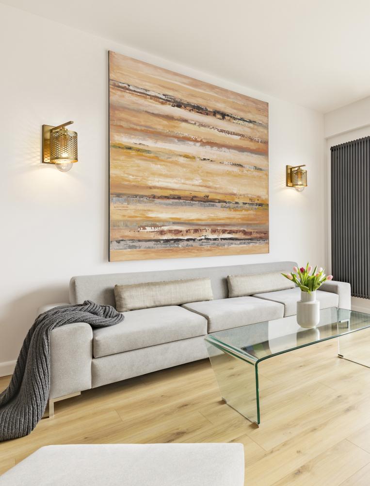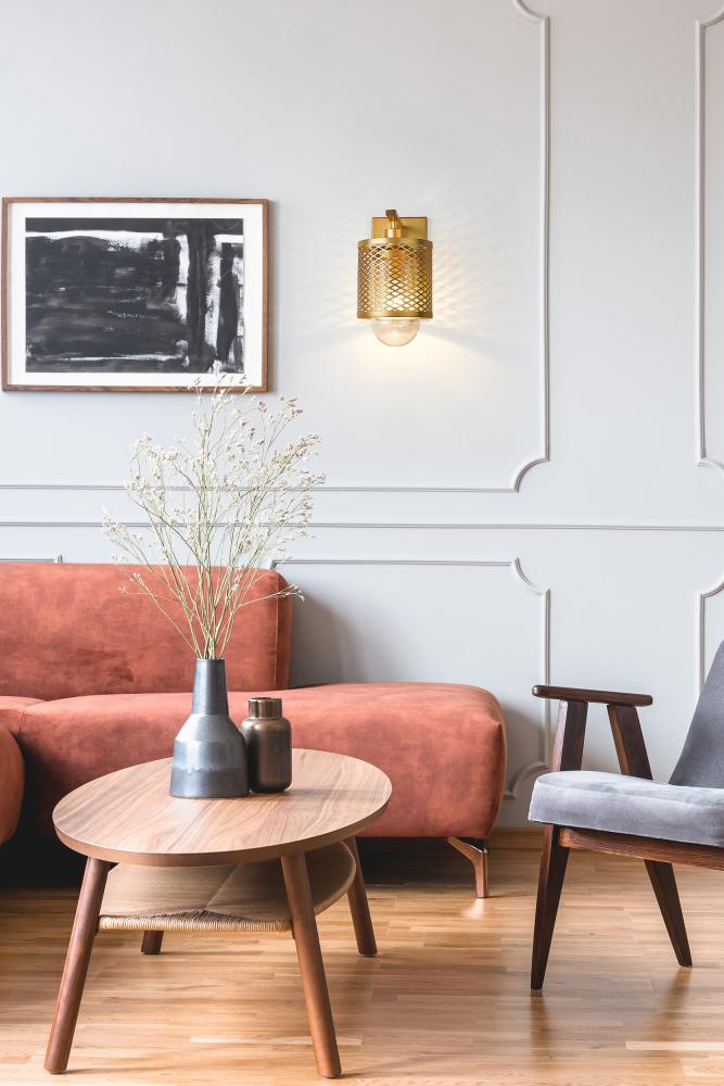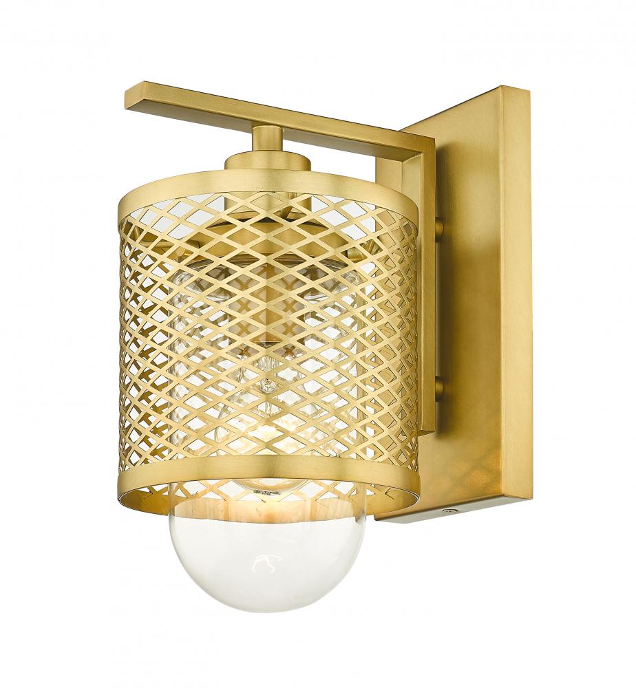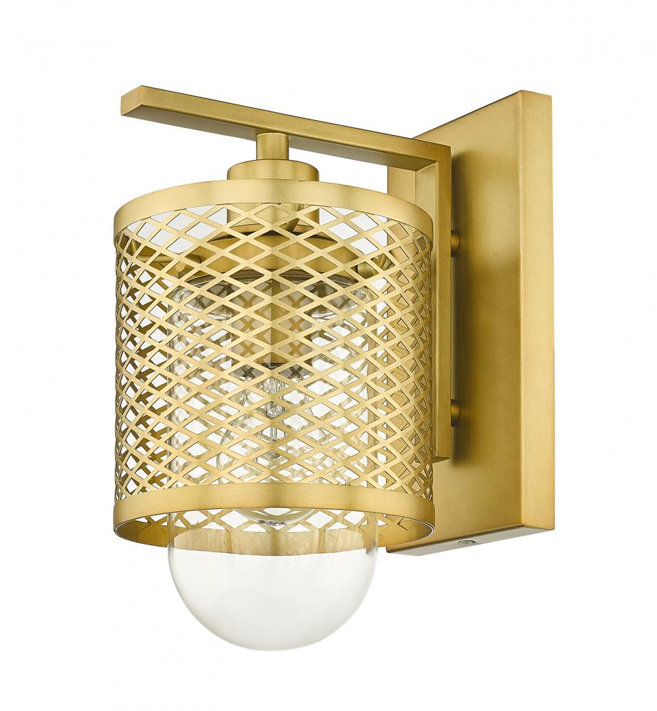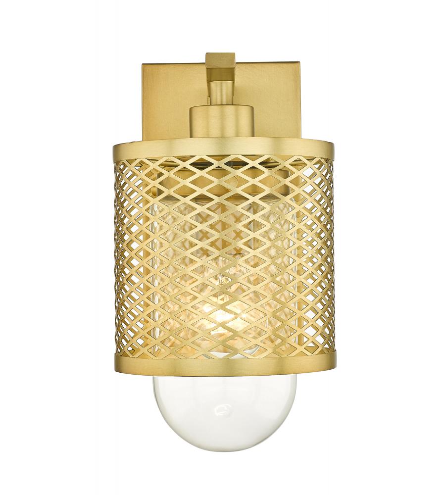 Industrial modern influences make way for this metropolitan single light sconce. A perfect addition for bathroom vanities and welcoming foyers, this transitional wall sconce features a classical mesh metal cage in a warm rubbed brass finish for a glamorous touch. A clear glass interior shade showcases filament bulbs, lending an old-world feel and is capped with clear globe that peeks out from beneath and offers a diffused glow.