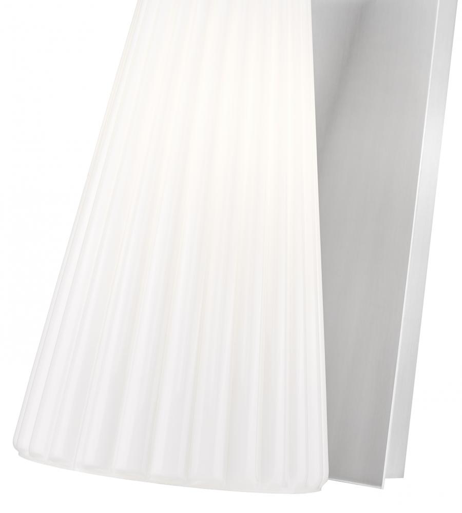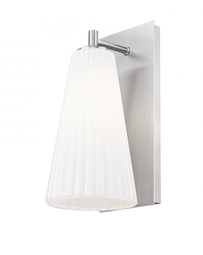 Showcasing radiant luminosity and a sleek silhouette, this modern one-light wall sconce is a standout choice for your living space. Its shade is crafted from delicate fluted white glass that creates a cool, sophisticated vibe. A rectangular backplate and arm feature a fresh brushed nickel finish thats sure to complement a surrounding decor.