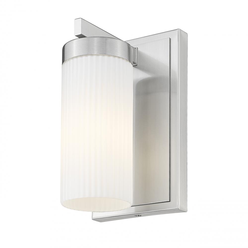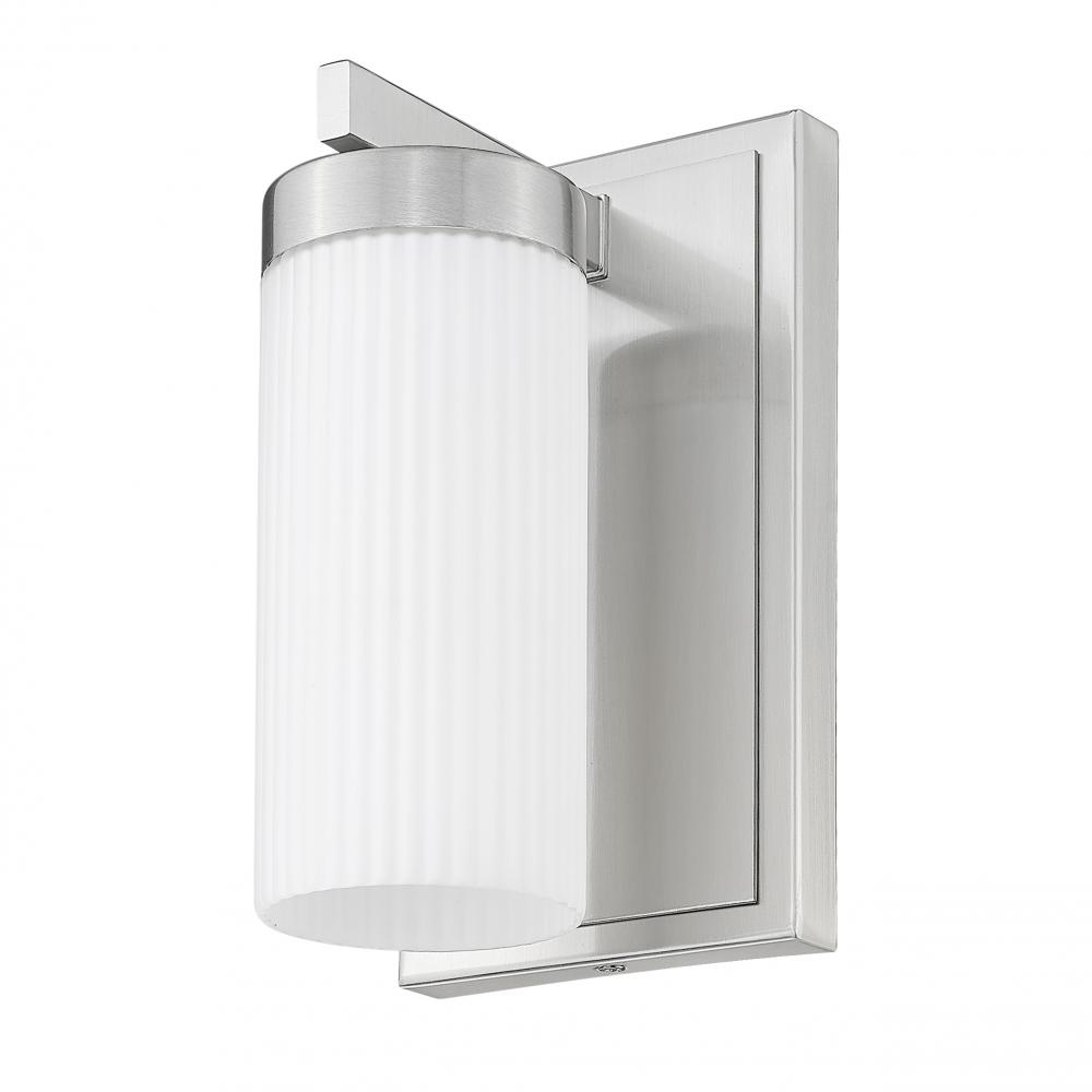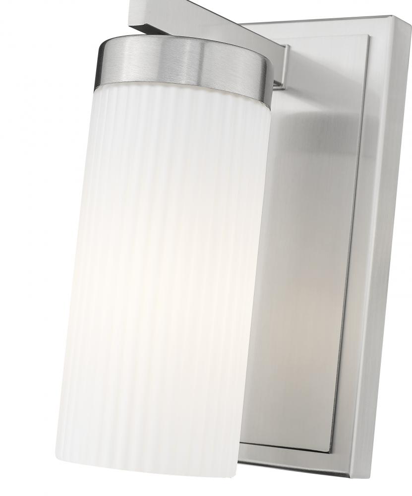 Modern form meets timeless clarity in this one-light wall sconce finished in brushed nickel. The ribbed glass shade adds texture and elegance, casting a soft glow that?s both clean and inviting. Its rectangular backplate grounds the piece with subtle architectural flair.
