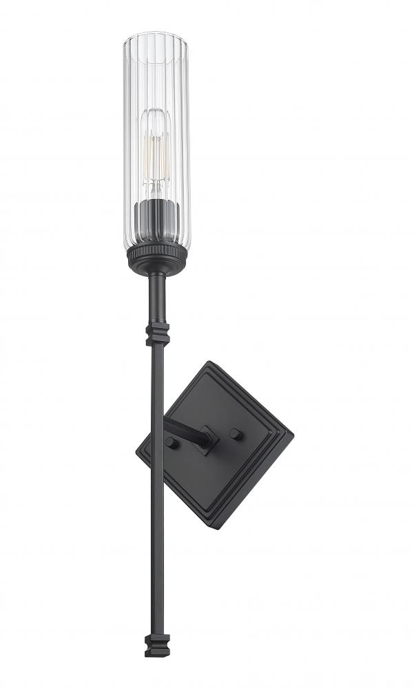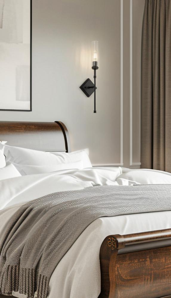 Delicate design evokes a champagne flute, with a slim stem and narrow fluted glass that diffuses illumination to reduce glare. A matte black finish offers excellent definition and detail, while stepped details on a diamond wall plate are a lovely touch. Add this charming design in a foyer or living area for exceptional ambiance.