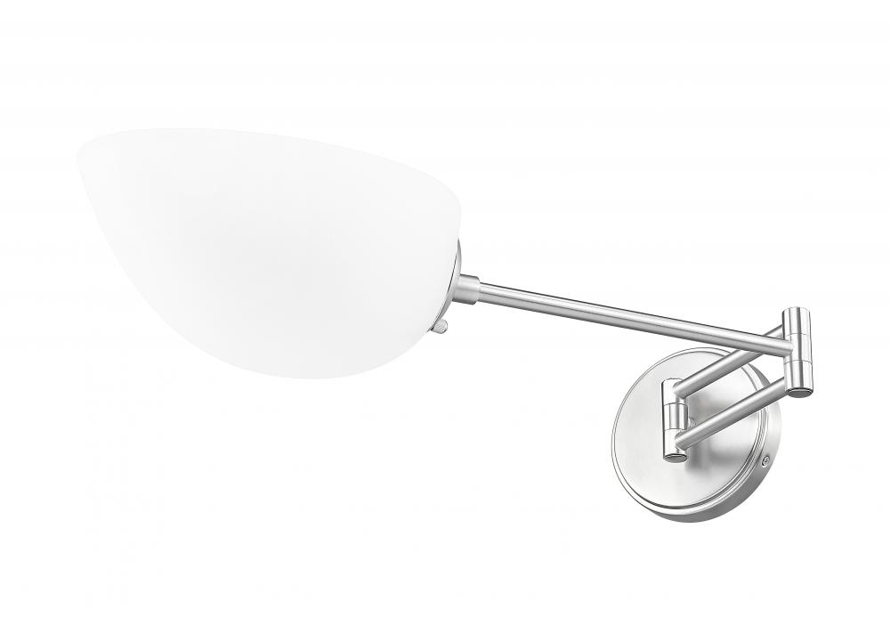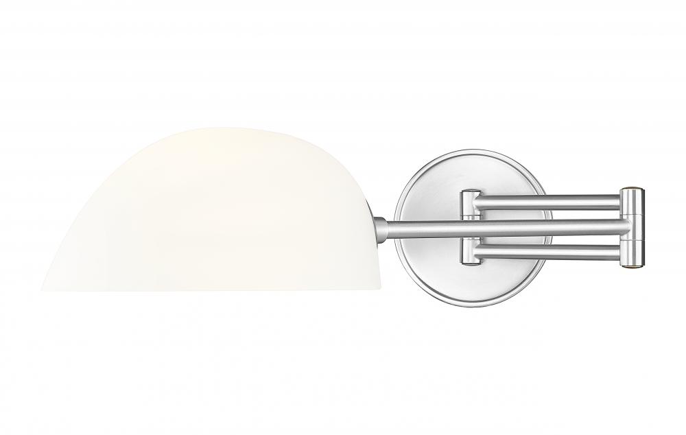 With a charming retro vibe, this one-light wall sconce rests on a simple design beginning with brushed nickel finish steel framing. This fixture is perfect for reading or tasks, as adjustable positioning of its opal glass hood shade contributes to excellent functionality. Direct lighting upward or downward to send more direct lighting, dimmable with built-in dimming features to offer precision illumination levels.