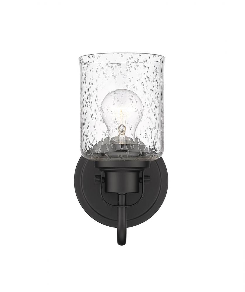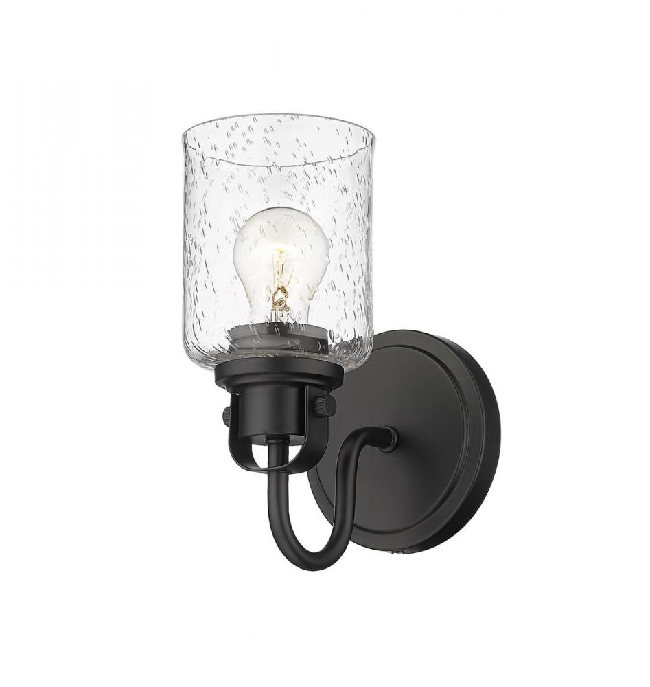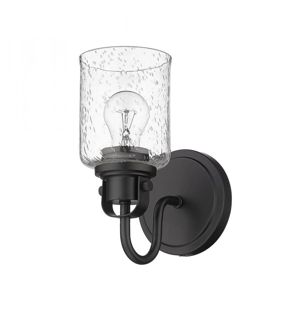 Showcase a modern light fixture in your space with a cylindrical seeded glass shade. This matte black wall sconce features an elegant, metropolitan style with its steel construction and curved neck. Install this piece in a bedroom, bathroom or hallway for alluring illumination.
