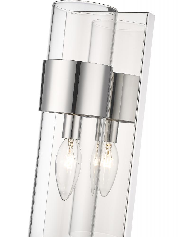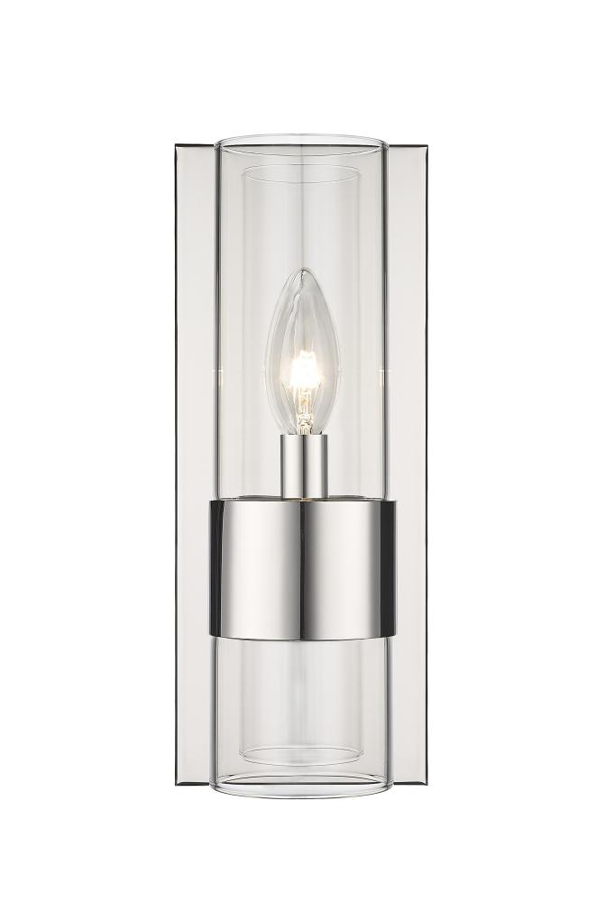 Sleek and minimal, this linear modern wall sconce illuminates a bathroom vanity or powder room with its understated sophistication. A steel plate holds a lantern-like clear glass tube that presents an exposed bulb, clasped by a wide polished nickel ring that gives a metallic touch, complementing bathroom hardware and fixtures. With its slender shape and design, this contemporary one-light wall sconce makes itself at home, flanked beside a mirror illuminating countertops and dressing areas.