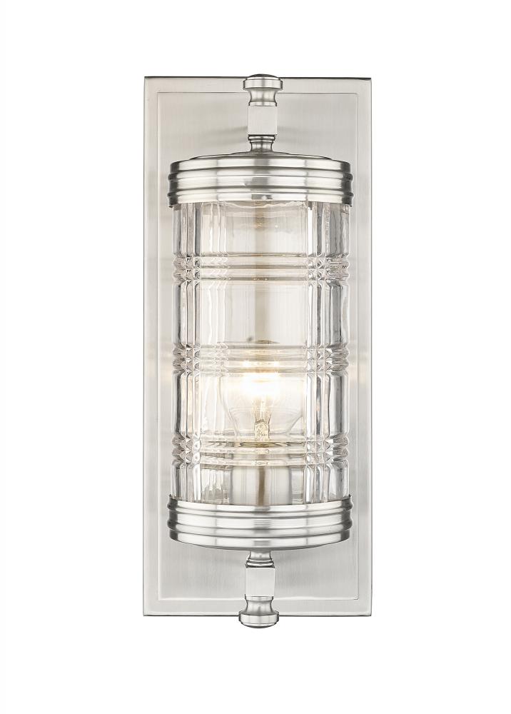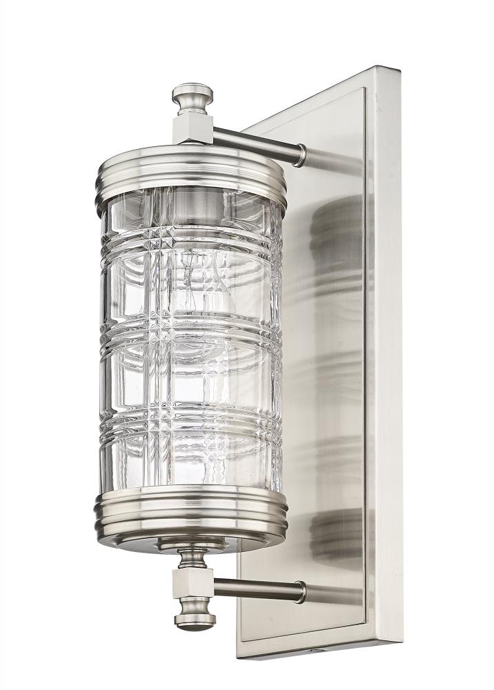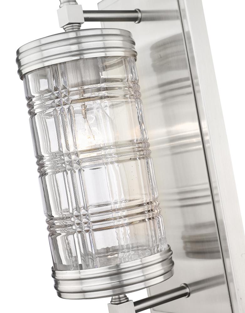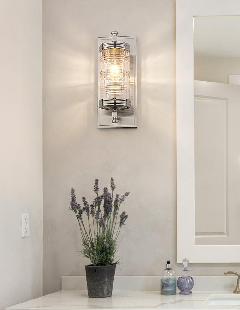 Transform a traditional powder room or master bathroom retreat into a breathtaking classically designed interior with this transitional wall sconce. Lending a restoration-like touch is a cut crystal-inspired glass shade with a Glen plaid pattern, suspended from a shiny brushed nickel plate and hardware. Timeless and sophisticated, this metropolitan one-light wall sconce also offers a beautiful illumination across bathroom countertops, creating a scintillated effect through the patterned glass lantern.