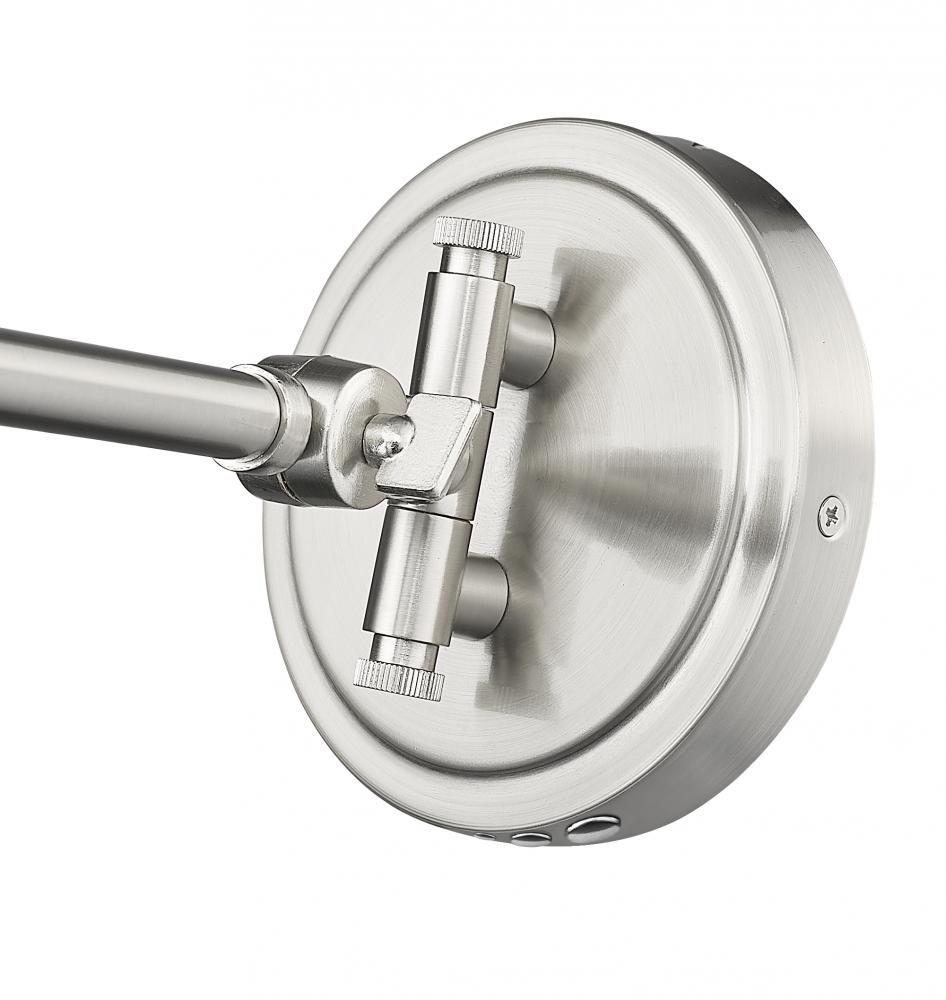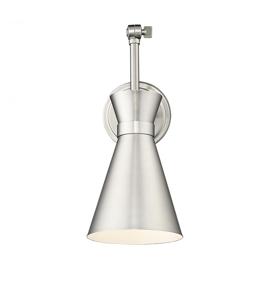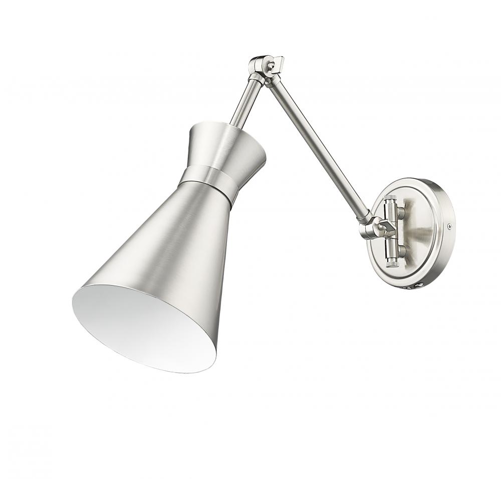 Mid-Century inspired tuxedo style highlights a charming wall sconce. Its metal shade showcases an hourglass profile, complete with an articulating arm for easy adjustment and precise lighting. Brushed nickel is the perfect finish accent, offering a rich, refined look and feel that complements in any setting. Install through hard-wiring or install cord-and-plug mounting to allow movement from space to space.