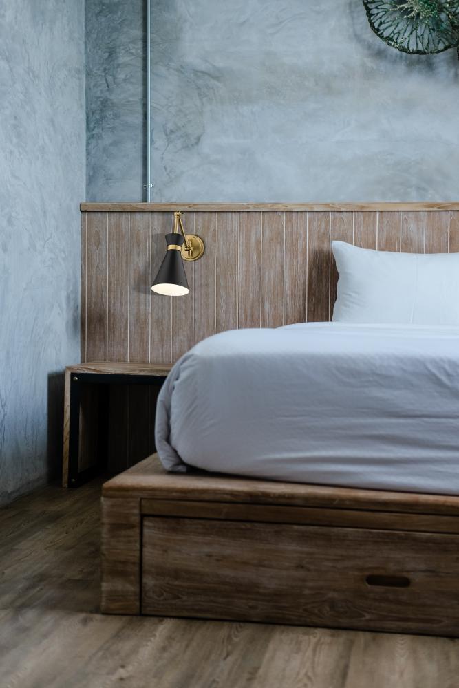 Mid-Century inspired tuxedo style highlights a charming wall sconce. Its metal shade showcases an hourglass profile, complete with an articulating arm for easy adjustment and precise lighting. Modern gold is the perfect finish accent, offering a rich, refined look and feel with a matte black shade, complementing in any setting. Install through hard-wiring or install cord-and-plug mounting to allow movement from space to space.