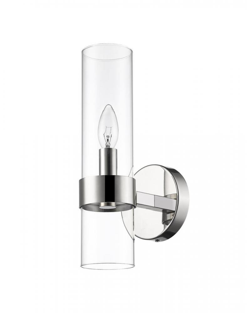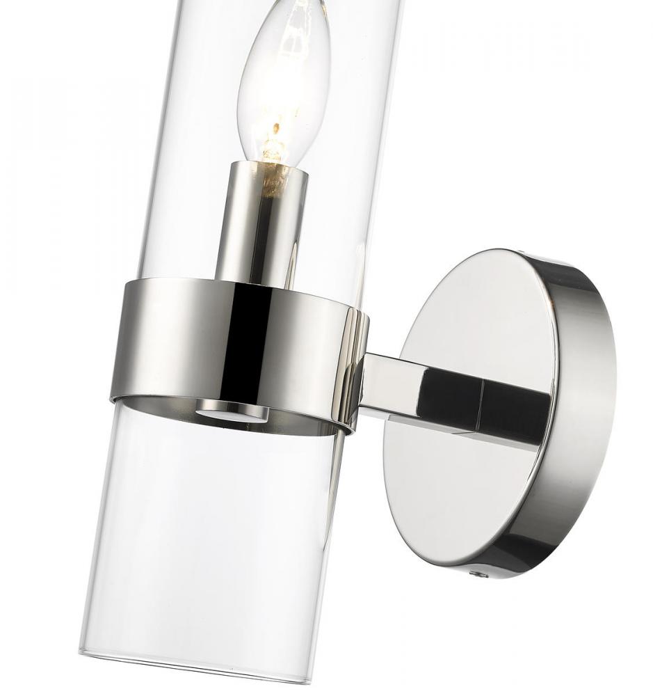 A classic polished nickel metal frame offers a hint of drama to this distinctive Datus one-light wall sconce. Contemporary vibes infuse an easy-living attitude with prominence in a sleek design featuring a slender clear glass cylinder shade mounted to a sophisticated polished nickel finish solid steel frame and mount. Bring ambient lighting to a hallway, bath space, or main living area with this sconce with a minimalist yet impressionable flavor.