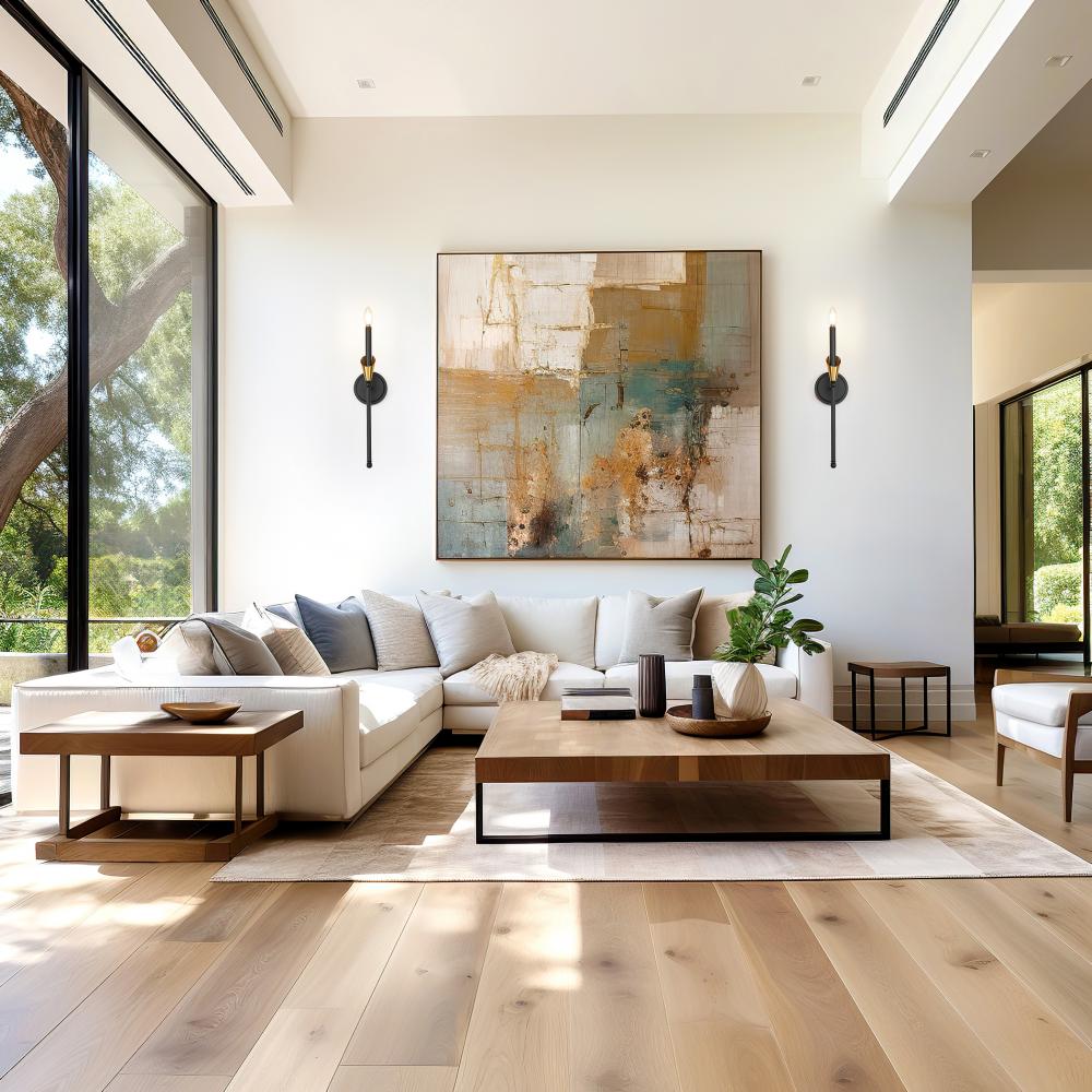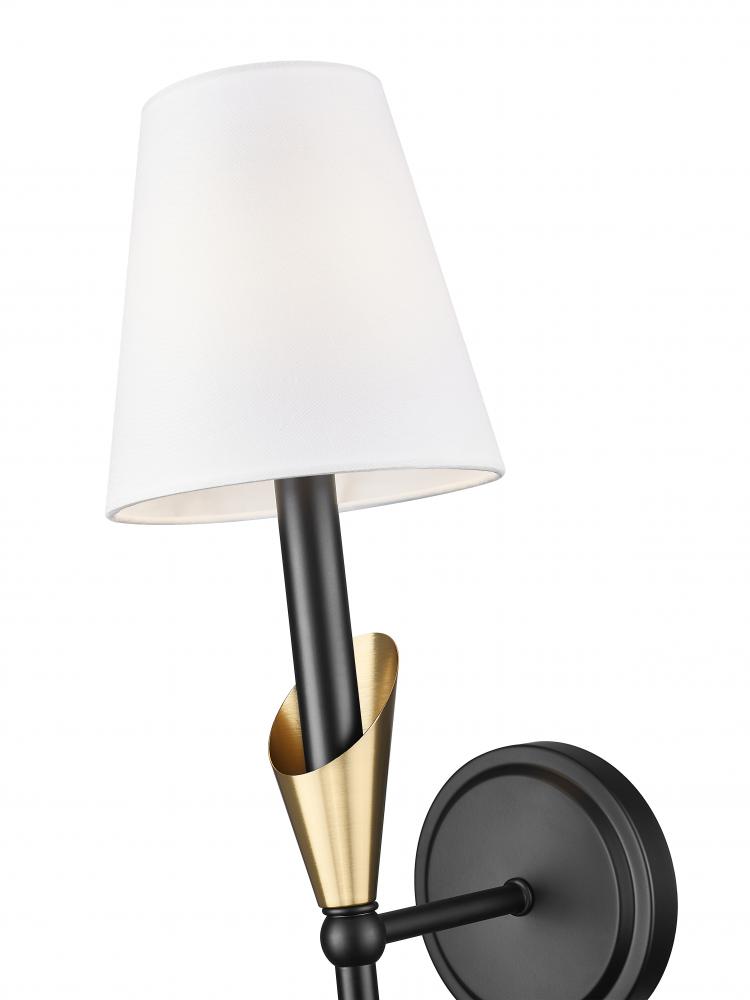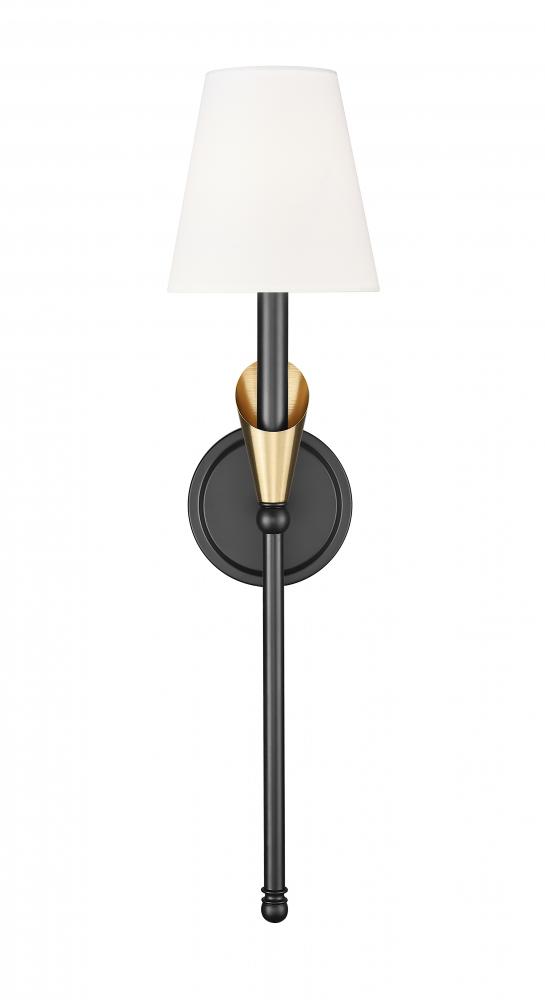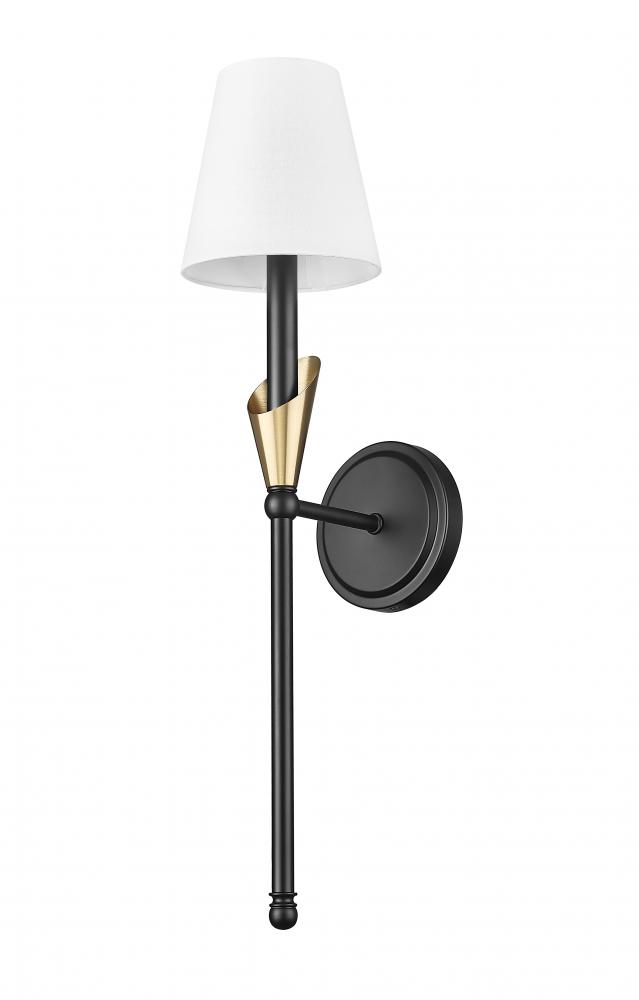 Blending organic form with a two-tone twist, this sconce elevates its minimalist frame with a hint of luxe. The matte black-and-gold finish brings depth to the delicate silhouette, while the white fabric shade diffuses light with warmth and grace. From glam powder rooms to sleek hallways, it fits in anywhere with quiet confidence.