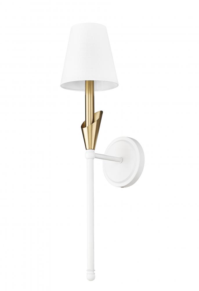 Inspired by nature and elevated with contrast, this sconce is a graceful balance of form and finish. The textured white frame curves with organic ease beneath a modern gold accent, echoing the lines of a calla lily. Topped with a soft white fabric shade, it brings sculptural beauty and warmth to any wall it touches.