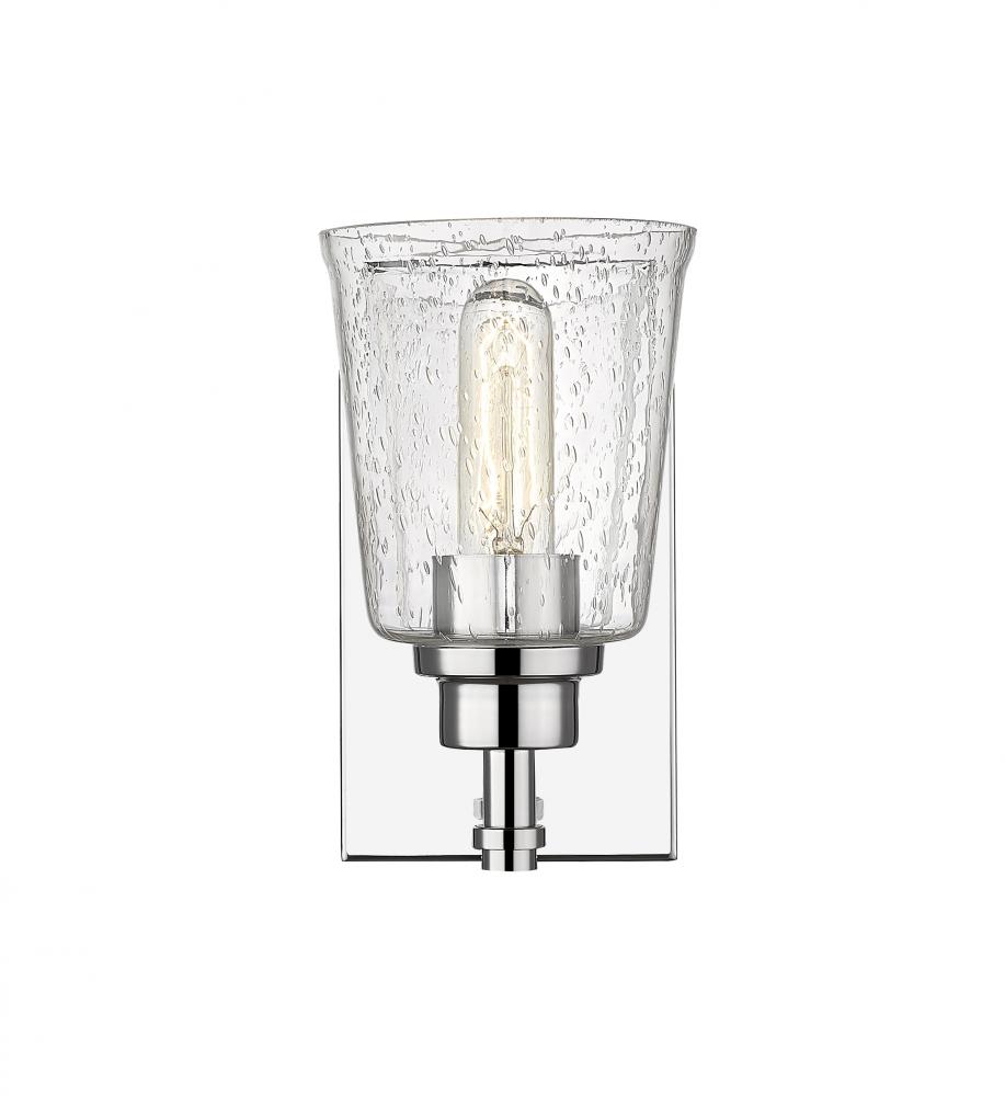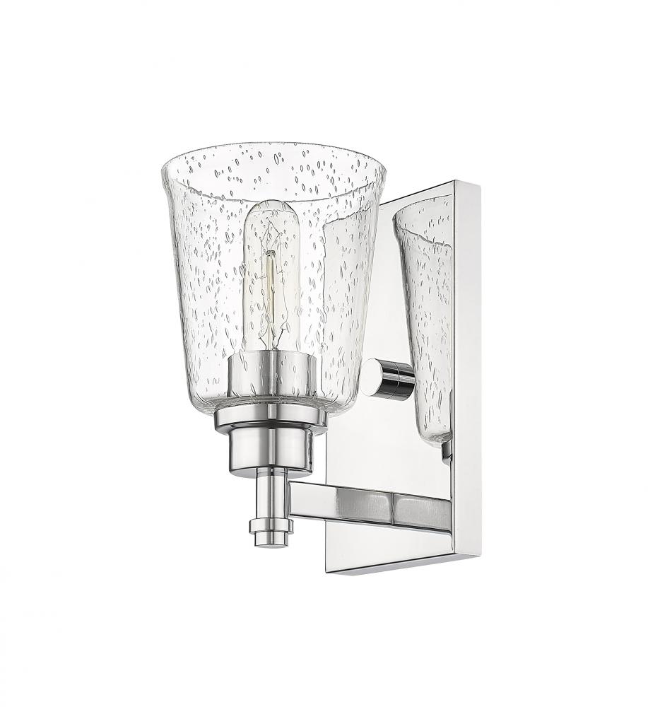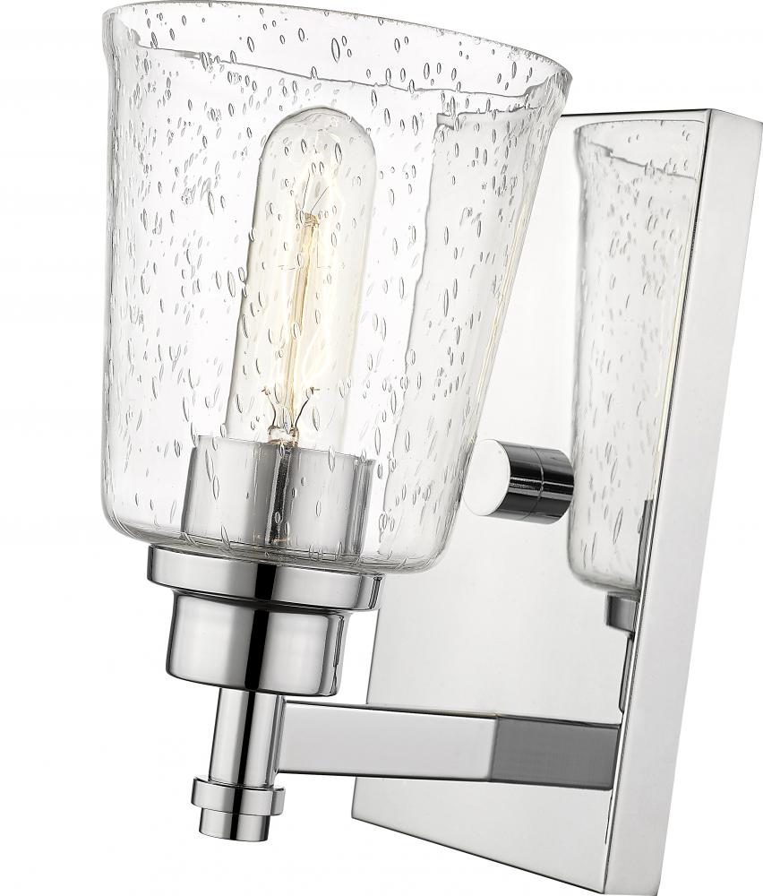 Classic elegance and a beautifully neutral finish create a fixture that expresses design personality in a bath or living space. This chrome steel wall sconce gains soft touches from a romantic clear seedy glass shade and delivers a sophisticated, artistic addition to contemporary or transitional decor.