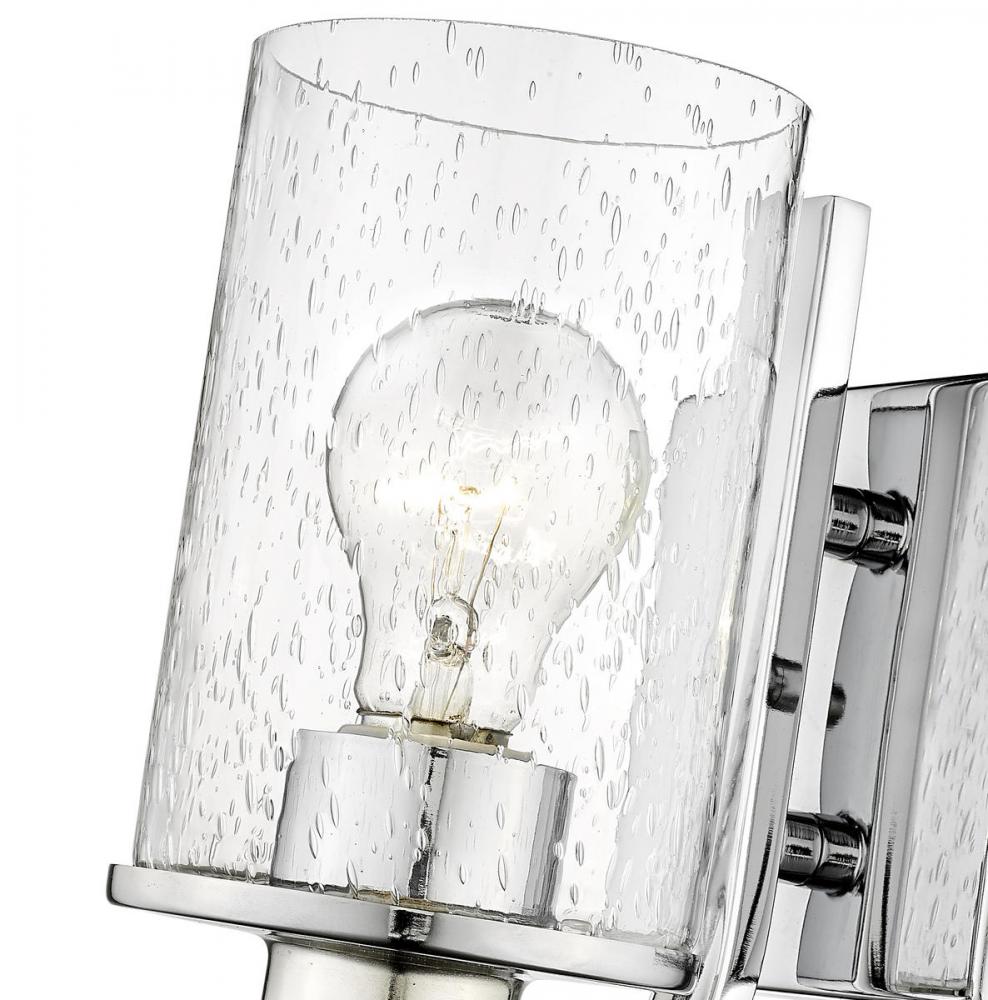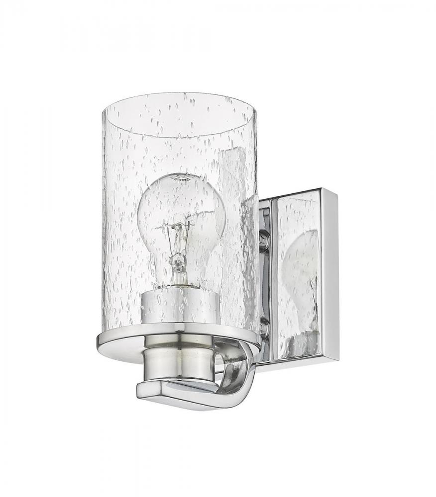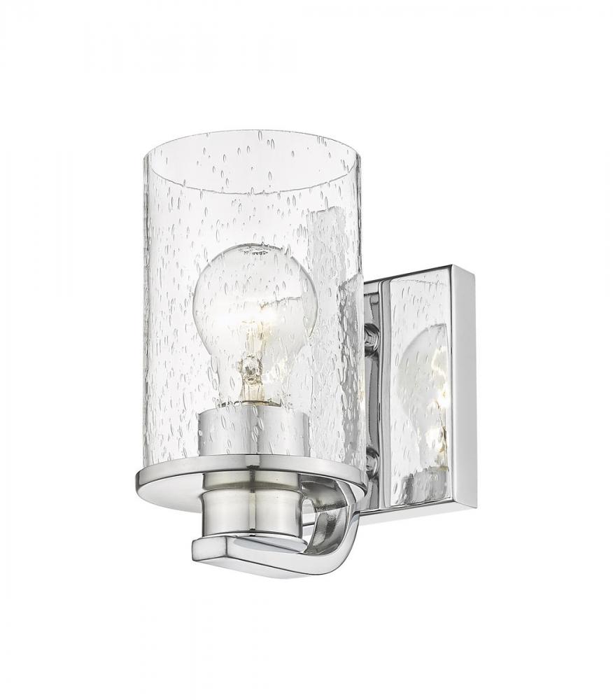 Classic elegance follows this one-light wall sconce from the Beckett collection, a superb choice for a contemporary bath space, hallway, or main living area. A simple yet extraordinary design blends romantic clear seedy glass with a mount, base, and arm crafted of bright chrome finish steel.